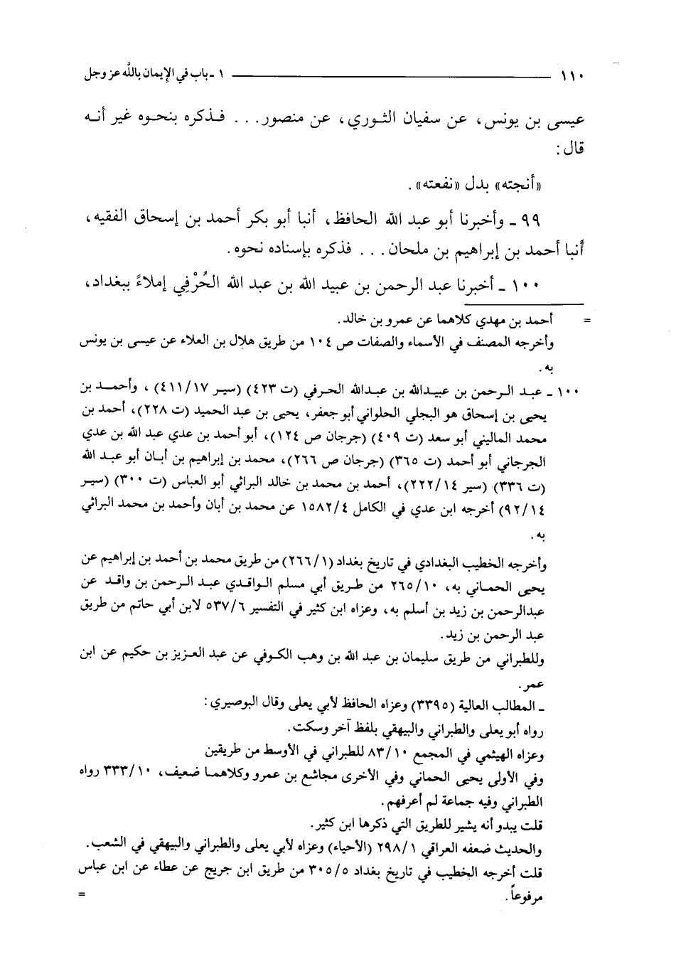 100 - أخبرنا عبد الرحمن بن عبيد الله الحرفي إملاء ببغداد ثنا حبيب بن الحسن القزاز ثنا أبو جعفر بن يحيى بن إسحاق الحلواني ثنا يحيى ـ يعني ابن عبد الحميد ـ