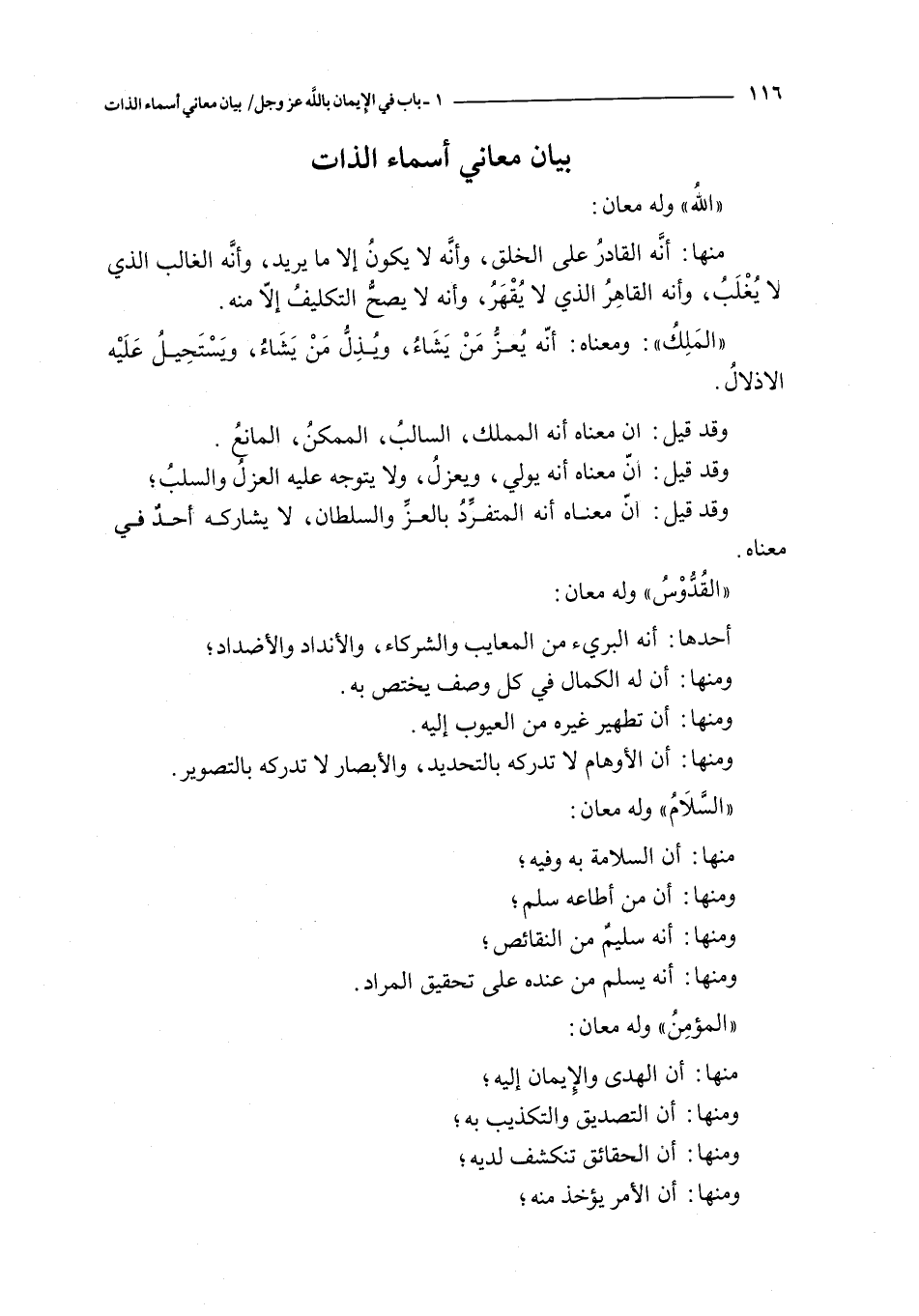 بيان معاني أسماء الذات ـ الله و له معان : منها أنه القادر على الخلق و أنه لا يكون إلا ما يريد و أنه الغالب الذي لا يغلب و أنه القاهر الذي لا يقهر و أنه لا يصح التكليف إلا منه ـ الملك : و معناه : أنه يعز من يشاء و يذل من يشاء و يستحيل عليه الاذلال و قد قيل : إن معناه أن المملك السالب الممكن المانع و قد قيل : أن معناه أنه يولي و يعزل و لا يتوجه عليه العزل و السلب و قد قيل : أن معناه أنه المتفرد بالعز و السلطان لا يشاركه أحد في معناه القدوس و له معان : أحدها : أنه البريء من المعايب و الشركاء و الأنداد و الأضداد و منها : أن له الكمال في كل وصف يختص به و منها : أن تطهير غيره من العيوب إليه و منها : أن الأوهام لا تدركه بالتحديد و الأبصار لا تدركه بالتصوير ـ السلام : و له معان : منها : أن السلامة به و فيه و منها : أن من أطاعه سلم و منها : أنه سليم من النقائص و منها أنه يسلم من عنده على تحقيق المراد المؤمن و له معان : منها : أن الهدى و الإيمان إليه و منها : أن التصديق و التكذيب به و منها : أن الحقائق تنكشف لديه و منها : أن الأمر يؤخذ منه و منها : أن القول قوله لا خلاف عليه ومنها استحالة الزوال عليه و منها : تعذر المنازعة له المهيمن : و هو من أسامي الكمال يجمع أوصاف الفضل و ينقض أوصاف النقص كأن الكمال الذي لا يصح عليه الزوال تدخل فيه الشهادة و الحفظ و العطاء و المنع و الاختصاص به عن الغير العزيز : و له معان : منها أنه لا يرام و منها : أنه لا يخالف في المراد و منها : أنه لا يخوف بالتهديد و منها : أنه لا يحط عن المنزلة و منها : أنه يعذب من أراد و منها : أنه ملجأ الهاربين و منها : أن إليه مطالب المريدين و منها : أن عليه طريق المارقين و منها : أن عليه ثواب العاملين و منها : أنه لا يوجد له مثل و أنه لا يحد بحد و أنه لا يصح عليه نقص الجبار : و له معان : منها : أنه لا يحنو عند التعذيب و لا يشفق عند البذل إذا أعطى أعطى عن سعة و إذا منع منع عن قدرة و منها : أنه لا يكترث بالناكثين و لا يفرح بالمخلصين و منها : أنه لا يتمنى ما لا يكون و لا يتلهف على ما لم يكن و منها : أنه لا يناقش في الفعل و لا يطالب بالعلة و لا يحجر عليه في مقدوره و أنه لا يجب عليه شيء بتة و أنه يذل عند عزته الأعزاء و يشرف عند تقريبه الأذلاء المتكبر : و له معان : منها : أنه لا مقدار لشيء عنده و منها : أنه لا يؤثر فيه اللوم و لا يصح عليه العقاب و منها : أنه لا يخلق للنفع و لا يخترع للدفع و أنه لا يتوجه عليه المنة بالطاعة و العبادة و لا يلزمه الثواب عن المتابعة و أنه لا يشرف بالاتباع و لا ينحط بالاعتداء و أنه لا يأمر لفائدة و لا ينهى لعائدة العلي : و له معان : منها : أنه علي عن المالك و الآمر و الناهي و التحديد و الرسم و المنع و الإيجاب و منها : أنه علي عن الحاجة إلى الخلائق و الخلق و منها : أنه لا يسأل عما يفعل و لا يحاسب على ما يقبض العظيم : و له معان : منها : أنه يستحيل عليه التحديد و المساحة و منها : نفي الكثافة و الرقة و منها : وجوب التذلل و الخضوع عند الطاعة الجليل : و له معان : منها : أنه يجل عن أن يجوز عليه ما دل على الحدوث و منها : أنه يجب الانقياد له و منها : أنه لا يجل إلا من رفعة الكبير : و له معان : أنه لا يقع عليه المقدار و التقدير و لا يرد عليه في التدبير و لا يخالف في الأمور الحميد : و له معان محمودة و له صفات المدح و الكمال المجيد : و له معان : منها : أنه لا يساوي فيما له من أوصاف المدح و منها : أنه المنفرد بالجلال و الكبرياء و العز و منها : أن الذي يفيد من أوصاف المدح لغيره لا يكون إلا به الحق : و له معان : منها : أن لا يمكن رده و لا يصح رفعه و لا يوصف بالقدرة على ما يوجب ذمه و منها : أن ما لم يكن بأمره من غيره لم يحمد وصفه و منها : المبين لخلقه ما أرادهم له المبين : و له معان : منها : أنه بين لذوي العقول و منها : أن الفضل يقع به و منها : أن التحقيق و التمييز إليه و منها : أن الهداية به الواحد : و له معان : منها : أنه لا يجوز عليه التبعيض و لا يجوز عليه التشبيه و لا يصح الخروج من ملكه و لا حد لسلطانه الماجد : و له معان : منها : الا