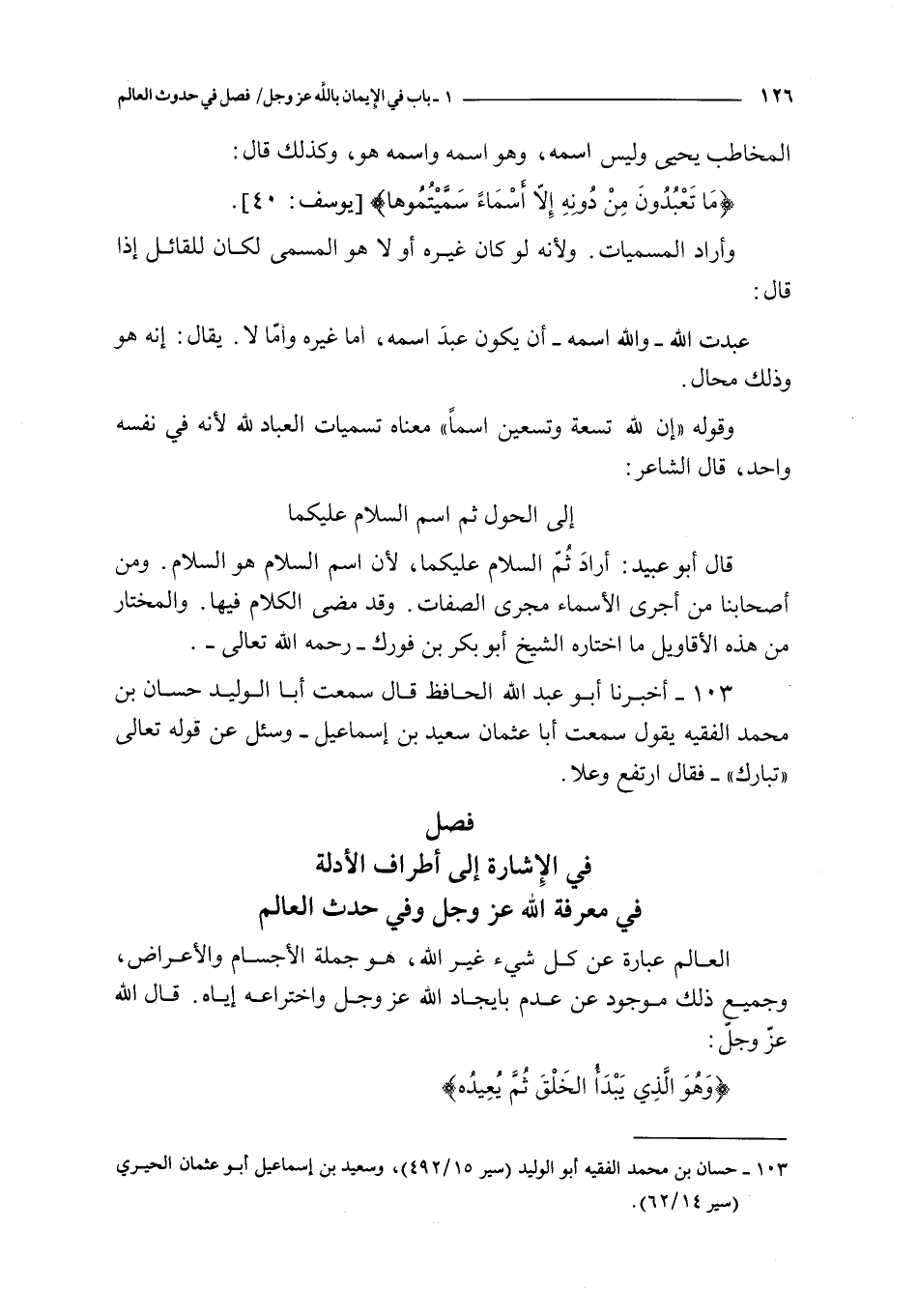 103 - أخبرنا أبو عبد الله الحافظ قال سمعت أبا الوليد حسان بن محمد الفقيه يقول سمعت أبا عثمان سعيد بن إسماعيل ـ : و سئل عن قوله { تبارك } ـ فقال ارتفع و علا