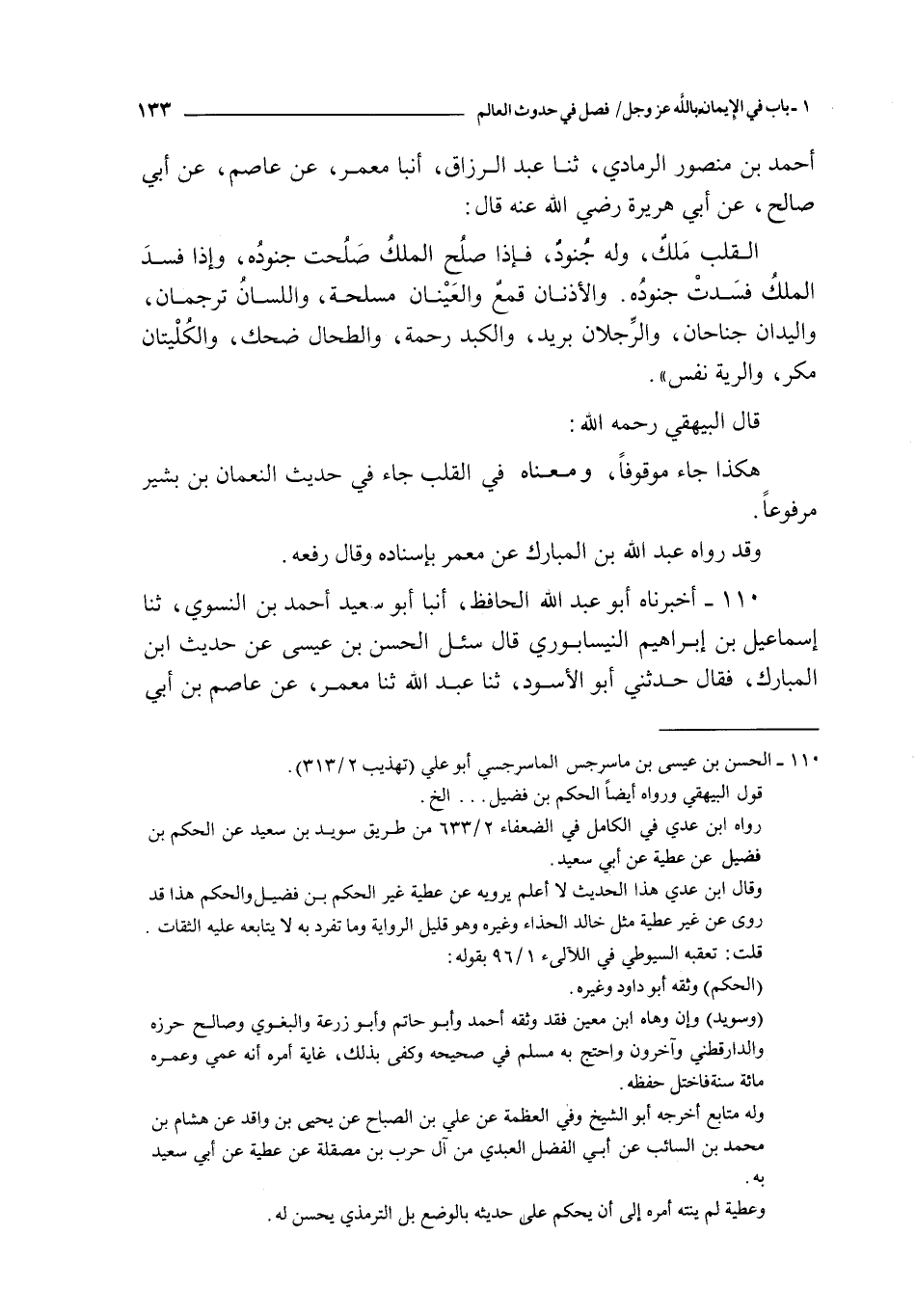 110 - أخبرناه أبو عبد الله الحافظ أنبأ أبو سعيد أحمد بن النسوي ثنا إسماعيل بن إبراهيم النيسابوري قال سئل الحسن بن عيسى عن حديث ابن المبارك فقال حدثني أبو الأسود ثنا عبد الله ثنا معمر عن عاصم بن أبي النجود عن أبي صالح عن أبي هريرة رفعه : فذكره