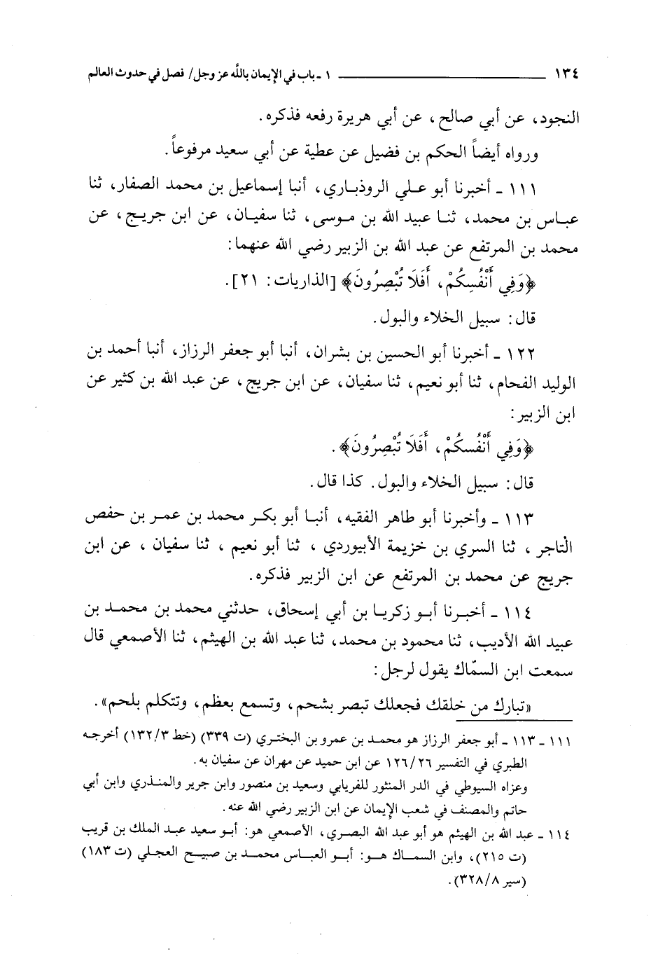 112 - أخبرنا أبو الحسين بن بشران أنبأ أبو جعفر الرزاز أنبأ أحمد بن الوليد الفحام ثنا أبو نعيم ثنا سفيان عن ابن جريج عن عبد الله بن كثير عن ابن الزبير : ـ { و في أنفسكم أفلا تبصرون }