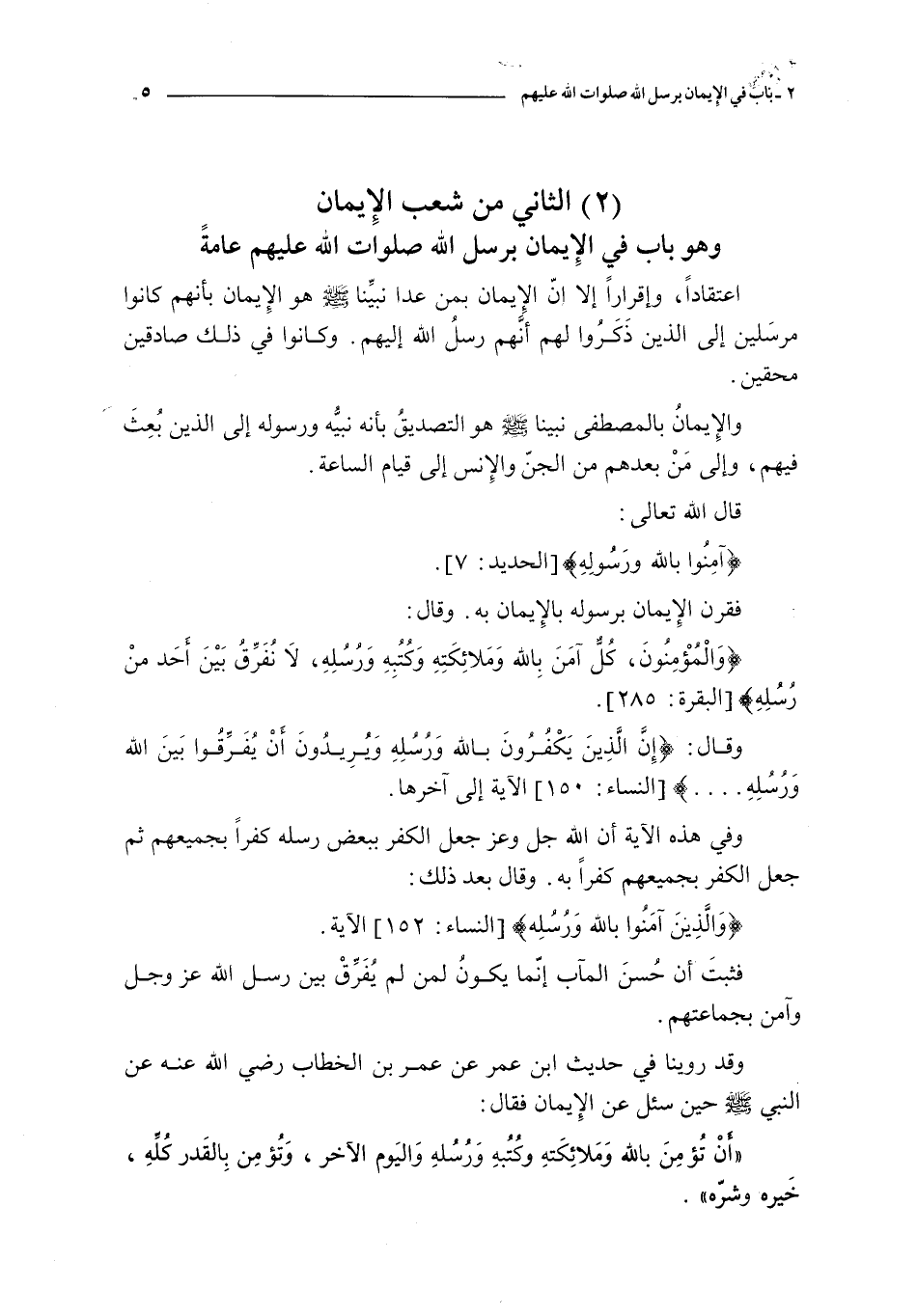 الثاني من شعب الإيمان و هو باب في الإيمان يرسل الله صلوات الله عليهم عامة ـ اعتقادا و إقرارا إلا أن الإيمان بمن عدا نبينا صلى الله عليه و سلم هو الإيمان بأنهم كانوا مرسلين إلى الذين ذكروا لهم أنهم رسل الله إليهم و كانوا في ذلك صادقين محقين و الإيمان بالمصطفي نبينا صلى الله عليه و سلم هو التصديق بأنه نبيه و رسوله إلى الذين بعث فيهم و إلى من بعدهم من الجن و الإنس إلى قيام الساعة قال الله تعالى : { آمنوا بالله ورسوله } فقرن الإيمان برسوله الإيمان به و قال : { والمؤمنون كل آمن بالله وملائكته وكتبه ورسله لا نفرق بين أحد من رسله } و قال : { إن الذين يكفرون بالله و رسله و يريدون أن يفرقوا بين الله و رسله } الآية إلى آخرها و في هذه الآية أن الله عز و جل جعل الكفر ببعض رسله كفرا بجميعهم ثم جعل الكفر بجميعهم كفرا به و قال بعد ذلك : { و الذين آمنوا بالله ورسله } الآية فثبت أن حسن المآب إنما يكون لمن لم يفرق بين رسل الله عز و جل و آمن بجماعتهم وقد روينا في حديث ابن عمر عن عمر بن الخطاب رضي الله عنه عن النبي صلى الله عليه و سلم حين سئل عن الإيمان فقال : أن تؤمن بالله و ملائكته و كتبه و رسله و اليوم الآخر و تؤمن بالقدر كله خيره وشره