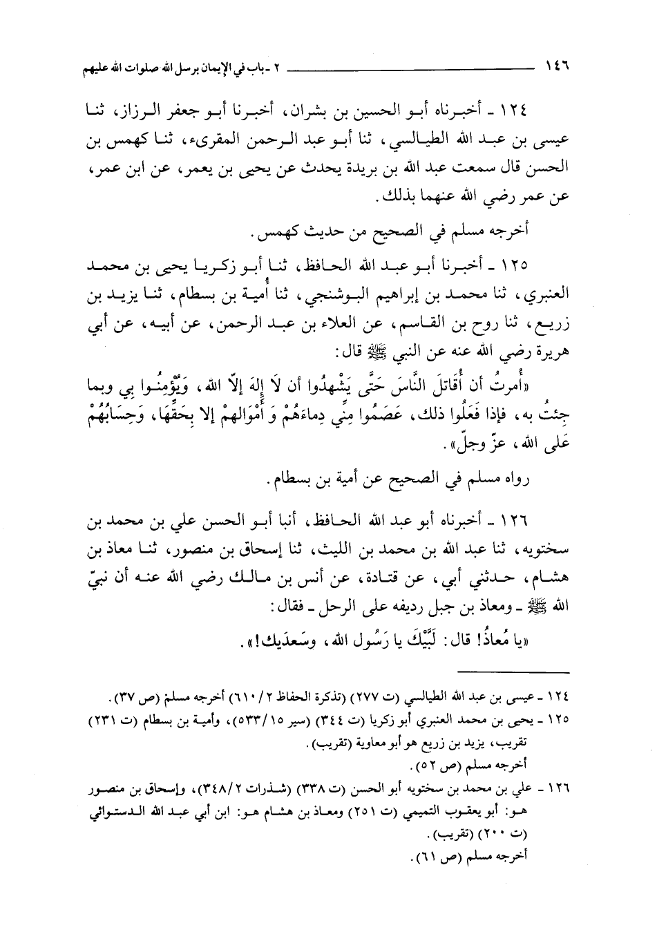126 - أخبرناه أبو عبد الله الحافظ أنبأ أبو الحسن علي بن محمد بن سختويه ثنا عبد الله بن محمد بن الليث ثنا إسحاق بن منصور ثنا معاذ بن هشام حدثني أبي عن قتادة عن أنس بن مالك رضي الله عنه : أن النبي صلى الله عليه و سلم ـ و معاذ بن جبل رديفه على الرحل ـ فقال :