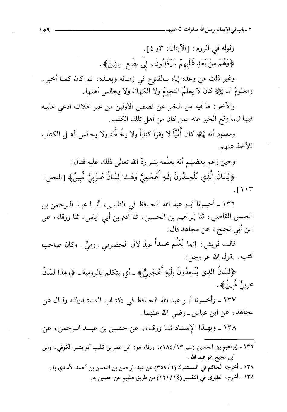 136 - أخبرنا أبو عبد الله الحافظ في التفسير أنبأ عبد الرحمن بن الحسن القاضي ثنا إبراهيم بن الحسين ثنا آدم بن أبي إياس ثنا ورقاء عن ابن أبي نجيح عن مجاهد قال : قالت قريش : إنما يعلم محمدا عبد لآل الحضرمي رومي و كان صاحب كتب يقول الله عز و جل : { لسان الذي يلحدون إليه أعجمي } ـ أي يتكلم بالرومية ـ { و هذا لسان عربي مبين }