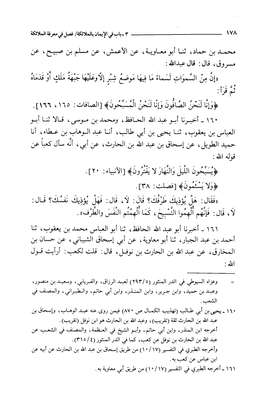 161 - أخبرنا أبو عبد الله الحافظ ثنا أبو العباس محمد بن يعقوب ثنا أحمد بن عبد الجبار ثنا أبو معاوية عن أبي إسحاق الشيباني عن حسان بن المخارق عن عبد الله بن الحارث بن نوفل قال : قلت لكعب : أرأيت قول الله :