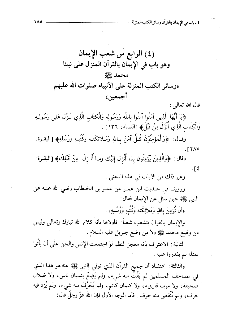 الرابع من شعب الإيمان و هو باب في الإيمان بالقرآن المنزل على نبينا محمد صلى الله عليه و سلم و سائر الكتب المنزلة على الأنبياء صلوات الله عليهم أجمعين قال الله تعالى : { يا أيها الذين آمنوا آمنوا بالله و رسوله و الكتاب الذي نزل على رسوله و الكتاب الذي أنزل من قبل } و قال : { والمؤمنون كل آمن بالله وملائكته وكتبه ورسله } و قال { و الذين يؤمنون بما أنزل إليك و ما أنزل من قبلك } و غير ذلك من الآيات في هذه المعنى و روينا في حديث ابن عمر عن عمر بن الخطاب رضي الله عنه عن النبي صلى الله عليه و سلم حين سئل عن الإيمان فقال : أن تؤمن بالله و ملائكته و كتبه و رسله و الإيمان بالقرآن يتشعب شعبا فأولاها بأنه كلام الله تبارك و تعالى و ليس من وضع محمد صلى الله عليه و سلم و لا من وضع جبريل عليه السلام الثانية : الاعتراف بأنه معجز النظم لو اجتمعت الإنس و الجن على أن يأتوا بمثله لما يقدروا عليه و الثالثة : اعتقاد أن جميع القرآن الذي توفي النبي صلى الله عليه و سلم عنه هو هذا الذي في مصاحف المسلمين لم يفت منه شيء و لم يضع بنسيان ناس و لا ضلال صحيفة و لا موت قارئ و لا كتمان كاتم و لم يحرف منه شيء و لم يزد فيه حرف و لم ينقص منه حرف فأما الوجه الأول فإن الله عز و جل قال : { أفلا يتدبرون القرآن ولو كان من عند غير الله لوجدوا فيه اختلافا كثيرا } و قال : { و هذا كتاب أنزلناه مبارك فاتبعوه } و قال { لكن الله يشهد بما أنزل إليك أنزله بعلمه والملائكة يشهدون وكفى بالله شهيدا } و قال : { وإنه لتنزيل رب العالمين * نزل به الروح الأمين * على قلبك لتكون من المنذرين } و قال : { إنا أنزلناه قرآنا عربيا لعلكم تعقلون } و معناه : و الله أعلم أنزلنا الرسول المودى له به فيكون الرسول منتقلا من علو إلى سفل مؤديا للكلام الذي حفظه و ذلك بين في الآية قبلها و هو أنه أخير أنه نزل به الروح الأمين على قلب محمد صلى الله عليه و سلم ( فيكون جبريل عليه السلام منتقلا به من مقامه المعلوم إلى الأرض موديا له إلى محمد صلى الله عليه و سلم ) و أخبر في الآية قبلها أنه أنزله بعلمه و في الآية قبلها أنه من عنده لا من عند غيره و قال : { ألا له الخلق و الأمر } ففصل بين المخلوق و الأمر و لو كان الأمر مخلوقا لم يكن لتفصيله معنى و قال : { لولا كلمة سبقت من ربك } و السبق على الإطلاق يقتضي سبق كل شيء سواه و قال : { إنما قولنا لشيء إذا أردناه أن نقول له كن فيكون } فلو كان قوله مخلوقا تعلق بقول آخر و ذلك حكم ذلك القول حتى يتعلق بما لا يتناهى و ذلك محال قال الأستاذ أبو بكر محمد بن الحسن بن فورك رحمه الله فيما عسى أن يقال على هذا من السؤال الكلام على الحقيقة لا ينقل عنه إلا بدليل و قوله ( كن ) أمر بتكوين للمعدوم لا أمر تكليف بمنزله قوله : { كونوا حجارة } { كونوا قردة خاسئين } و يكون قوله ( كن ) متعلقا بما يكون في الوقت الذي يكون في المعلوم أنه يكون فيه فلا يكون ذلك الوقت إلا كان كما يكون نفسه سامعا للصوت وقت وجود الصوت و إن كان قبل ذلك سامعا أيضا إلا أنه يتعلق بالصوت وقت وجوده في أنه سمعه حينئذ لا قبله والفاء في قوله ( فيكون ) لا تقتضي أن يكون للتعقيب مع ما علق عليه لأن ذلك جواب ( إنما ) فكأنه قال لا يكون قوله ( كن ) متعلقا بما يكون إلا كان في الحال التي علم أنه يكون فيها و أن لا يوجب استقبال لأن ذلك مع ما بعده بمنزلة المصدر كما كان قوله : { و أن تصوموا خير لكم } معناه و الصيام خير لكم و ذلك لا يقتضي استقبالا قلنا و قد قال الله عز و جل في إثبات صفة الكلام لنفسه و نفي النفاد عنه : { قل لو كان البحر مدادا لكلمات ربي لنفد البحر قبل أن تنفد كلمات ربي ولو جئنا بمثله مددا } و إنما ذكرها بلفظ الجمع على طريق التعظيم كقوله : { إنا نحن نزلنا الذكر وإنا له لحافظون } قال البيهقي رحمه الله قال : { و كلم الله موسى تكليما } فوكده بالتكرار و أخبر الله عز و جل بما كلم به موسى فقال : { يا موسى * إني أنا ربك فاخلع نعليك إنك بالواد المقدس طوى * وأنا اخترتك فاستمع لما يوحى * إنني أنا الله لا إله إلا أنا فاعبدني وأقم الصلاة لذكري } إلى قوله : { و اصطنعتك لنفسي } 
