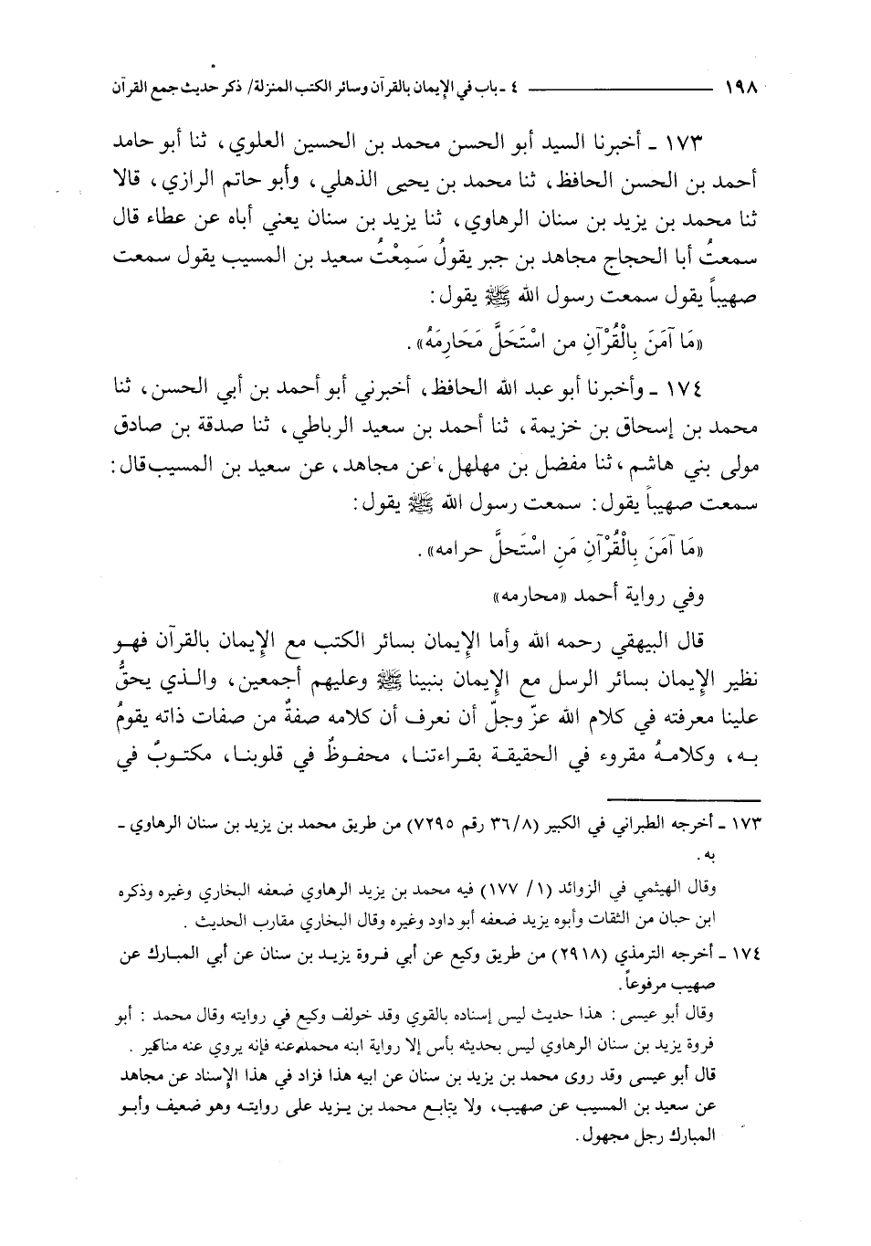 قال البيهقي رحمه الله و أما الإيمان بسائر الكتب مع الإيمان بالقرآن فهو نظير الإيمان بسائر الرسل مع الإيمان بنبينا صلى الله عليه و سلم و عليهم أجمعين و الذي يحق علينا معرفته في كلام الله عز و جل أن نعرف أن كلامه صفة من صفات ذاته يقوم به و كلامه مقروء في الحقيقة بقراءتنا محفوظ في قلوبنا مكتوب في مصاحفنا غير حال فيها كما أن الله تعالى مذكور في الحقيقة بألسنتنا معلوم في قلوبنا معبود في مساجدنا غير حال فيها و كلام الله تعالى و لا حد لاختلاف فيه و لا تعداد و لا حصر و لا قليل و لا كثير غير أنه إذا قرئ بالعربية سمي قرآنا وإذا قرئ بالسريانية سمي إنجيلا و إذا قرئ بالعبرانية سمي توراة و إنما سمي في هذه الشريعة قراءة ما سمي قرانا دون ما سمي توراة و إنجيلا لأن الله تعالى كذب أهل التوراة و الإنجيل الذين كانوا على عهد نبينا صلى الله عليه و سلم و أخبر عن خيانتهم و تحريفهم الكلام عن مواضعه و وضعهم الكتاب ثم يقولون هذا من عند الله و ما هو من عند الله و يقولون على الله الكذب و هم يعلمون فلا يأمن المسلم إذا قرأ شيئا من كتبهم أن يكون ذلك من وضع اليهود و النصاري
