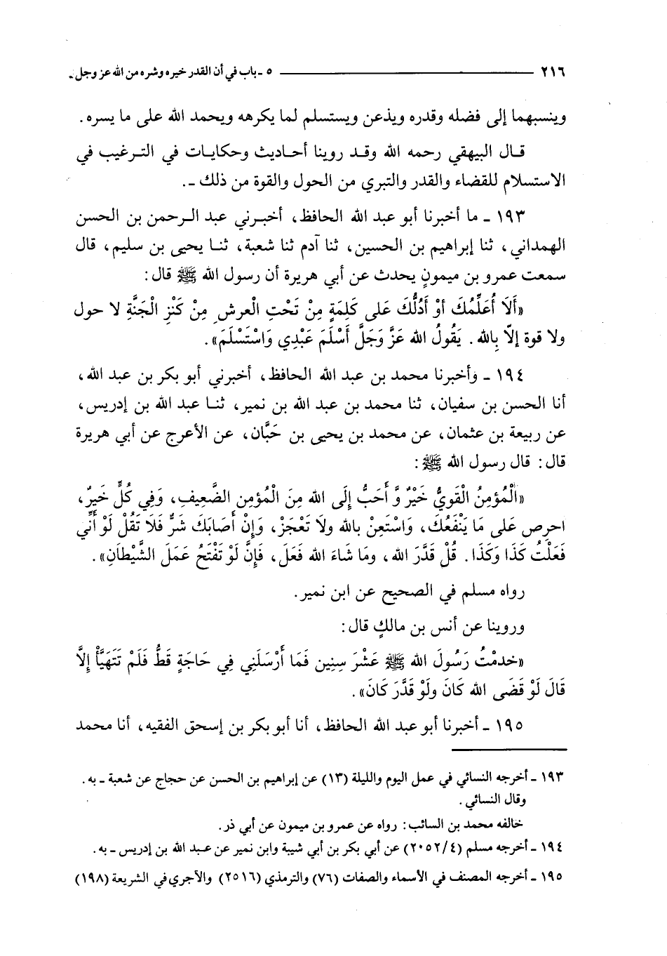 المؤمن القوي خير و أحب إلى الله من المؤمن الضعيف و في كل خير احرص على ما ينفعك و استعن بالله و لا تعجز و إن أصابك شر فلا تقل لو أني فعلت كذا و كذا قل قدر الله و ما شاء الله فعل فإن لو تفتح عمل الشيطان