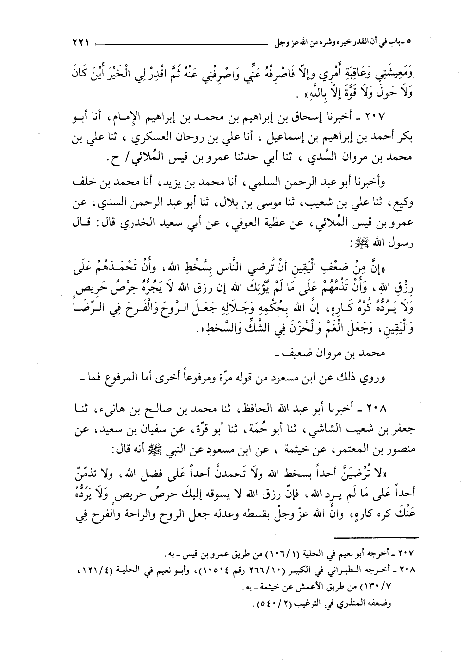 208 - أخبرنا أبو عبد الله الحافظ ثنا محمد بن صالح بن هانئ ثنا جعفر بن شعيب الشاشي ثنا أبو حمة ثنا أبو قرة عن سفيان بن سعيد عن منصور بن المعتمر عن خيثمة عن ابن مسعود : عن النبي صلى الله عليه و سلم أنه قال :