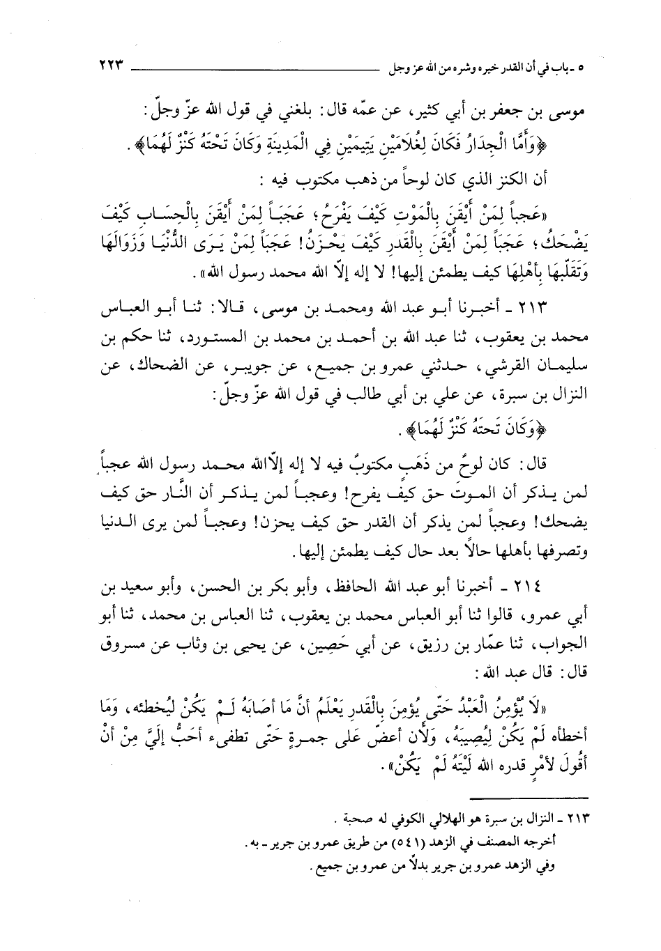 214 - أخبرنا أبو عبد الله الحافظ و أبو بكر بن الحسن و أبو سهيد بن أبي عمرو قالوا ثنا أبو العباس محمد بن يعقوب ثنا العباس بن محمد ثنا أبو الجواب ثنا عمار بن رزيق عن أبي حصين عن يحيى بن وثاب عن مسروق قال : قال عبد الله : لا يؤمن العبد حتى يؤمن بالقدر يعلم أن ما أصابه لم يكن ليخطئه و ما أخطأه لم يكن ليصيبه و لأن أعض على جمرة حتى تطفئ أحب إلي من أن أقول لأمر قدره الله ليته لم يكن