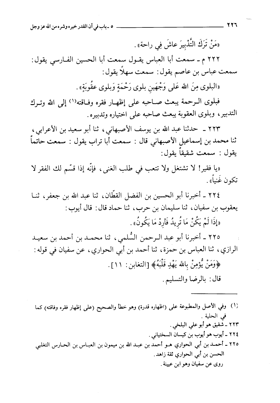 223 - حدثنا عبد الله بن يوسف الأصبهاني ثنا أبو سعيد بن الأعرابي ثنا محمد بن إسماعيل الأصبهاني قال : سمعت أبا تراب يقول : سمعت حاتما يقول : سمعت شقيقا يقول : يا فقير ! لا تشتغل و لا تتعب في طلب الغنى فإنه إذا قسم لك الفقر لا تكون غنيا