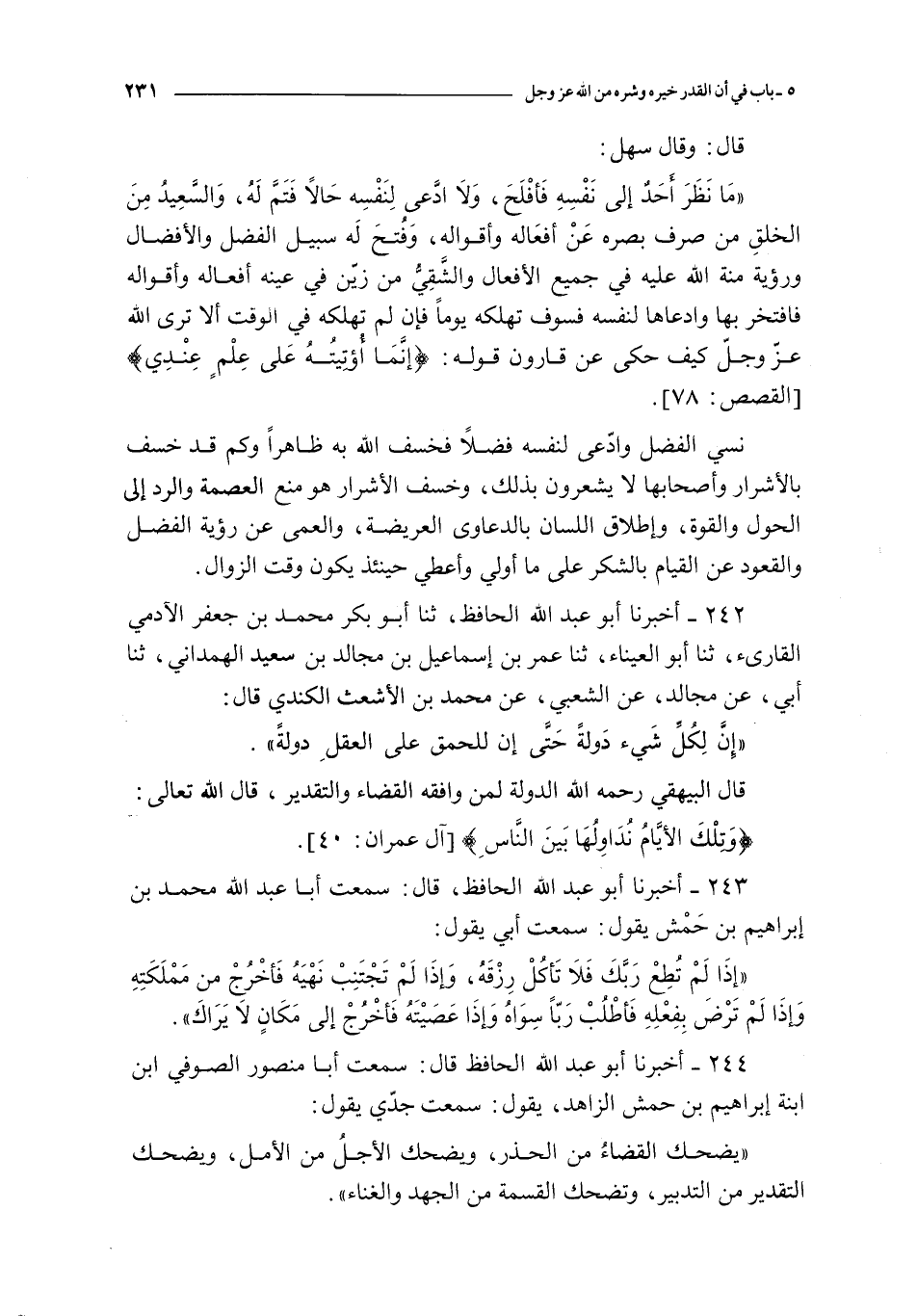 244 - أخبرنا أبو عبد الله الحافظ قال : سمعت أبا منصور الصوفي ابن ابنة إبراهيم بن حمش الزاهد يقول : سمعت جدي يقول : يضحك القضاء من الحذر و يضحك الأجل من الأمل ويضحك التقدير من التدبير و تضحك القسمة من الجهد و الغناء