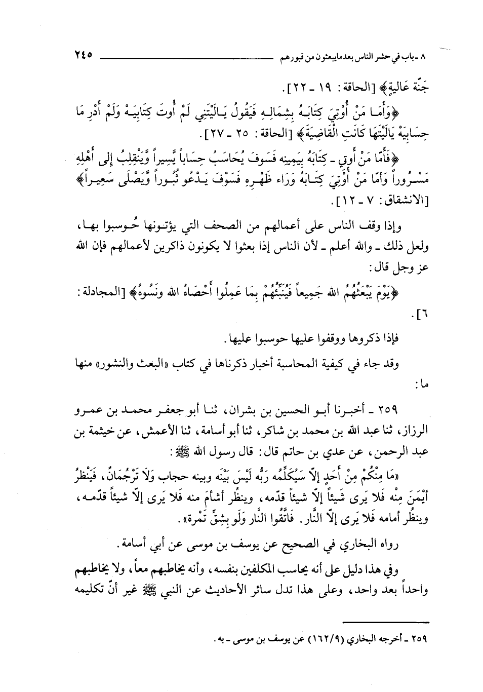 ما منكم من أحمد إلا سيكلمه ربه ليس بينه و بينه حجاب و لا ترجمان فينظر أيمن منه فلا يرى شيئا إلا شيئا قدمه و ينظر أشأم منه فلا يرى إلا شيئا قدمه و ينظر أمامه فلا يرى إلا النار فاتقوا النار و لو بشق تمرة