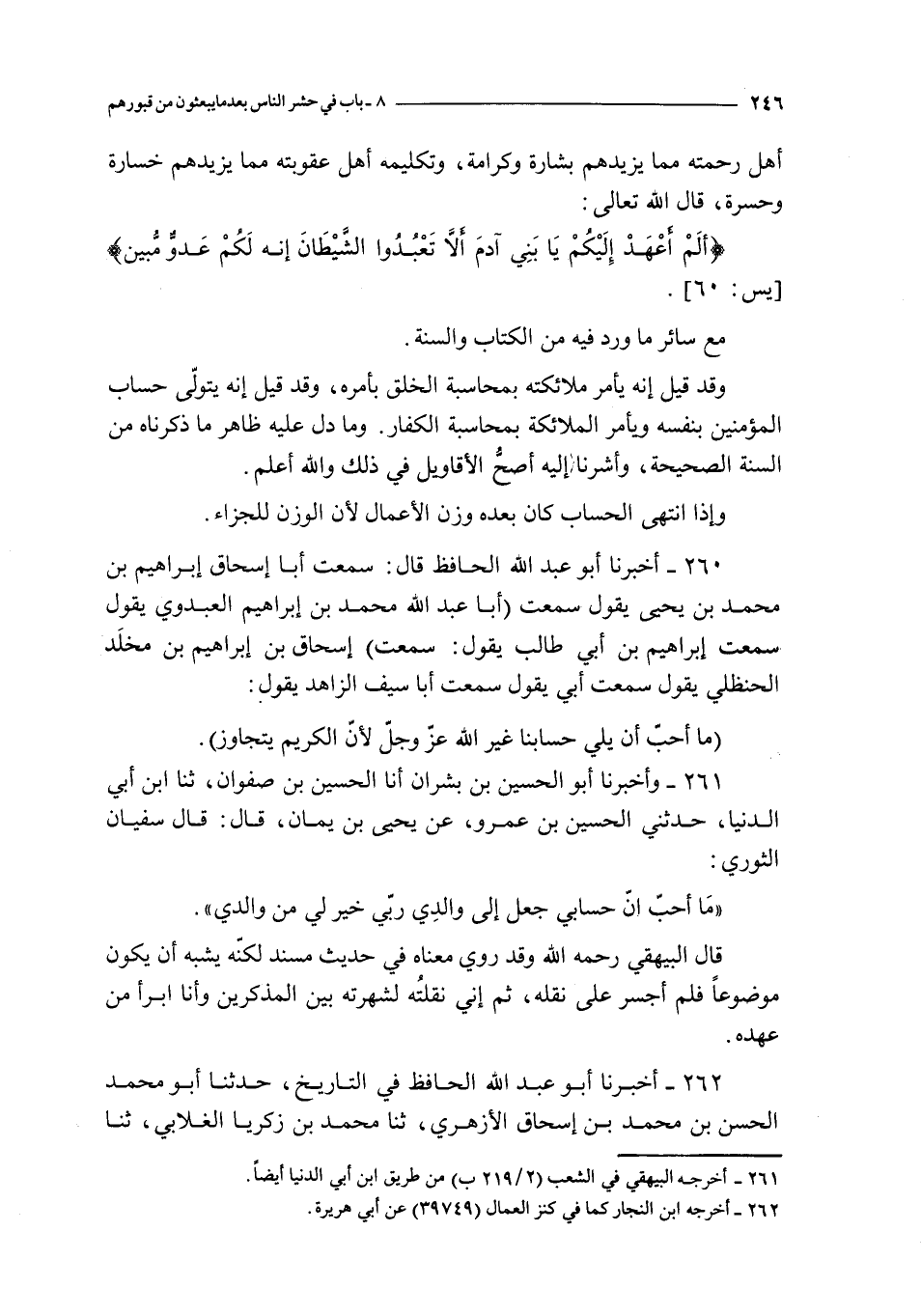 260 - أخبرنا أبو عبد الله الحافظ قال : سمعت أبا إسحاق إبراهيم بن محمد بن يحيى يقول سمعت أبا عبد الله محمد بن إبراهيم العبدوي يقول سمعت إبراهيم بن أبي طالب يقول : سمعت إسحاق بن إبراهيم بن مخلد الحنظلي يقول سمعت أبي يقول سمعت أبا سيف الزاهد يقول : ما أحب أن يلي حسابنا غير الله عز و جل لأن الكريم يتجاوز