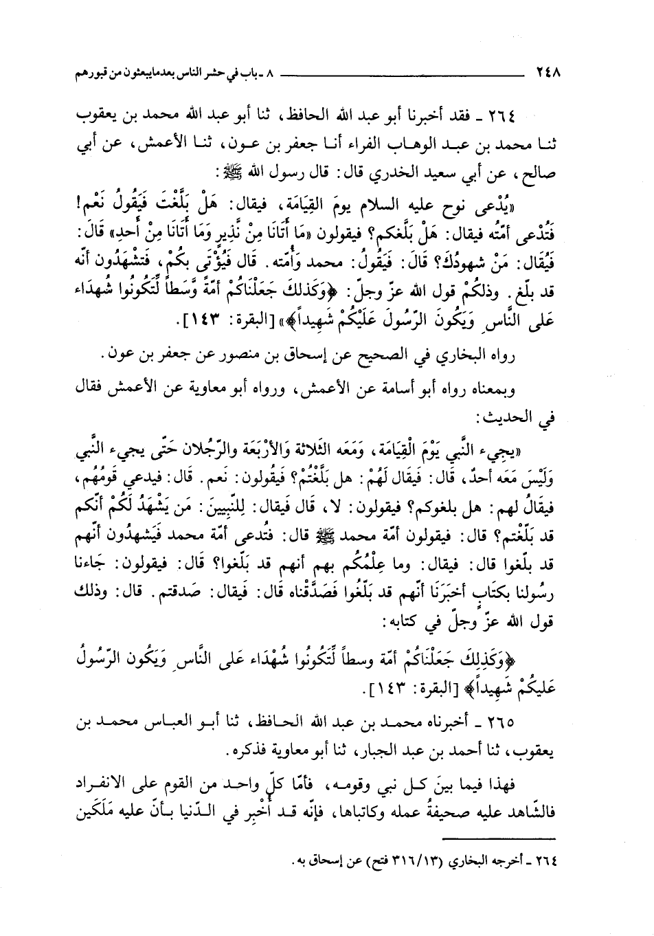 يجيء النبي يوم القيامة و معه الثلاثة و الأربعة و الرجلان حتى يجيء النبي و ليس معه أحد قال : فيقال لهم : هل بلغتم ؟ فيقولون : نعم قال : فيدعي قومهم فيقال لهم : هل بلغوكم ؟ فيقولون : لا قال فيقال : للنبيين : من يشهد لكم أنكم قد بلغتم ؟ قال : فيقولون أمة محمد صلى الله عليه و سلم قال : فتدعى أمة محمد فيشهدون أنهم قد بلغوا قال : فيقال : و ما علمكم بهم أنهم قد بلغوا ؟ قال : فيقولون : جاءنا رسولنا بكتاب أخبرنا أنهم قد بلغوا فصدقناه قال : فيقال : صدقتم قال : و ذلك قول الله عز و جل في كتابه :
