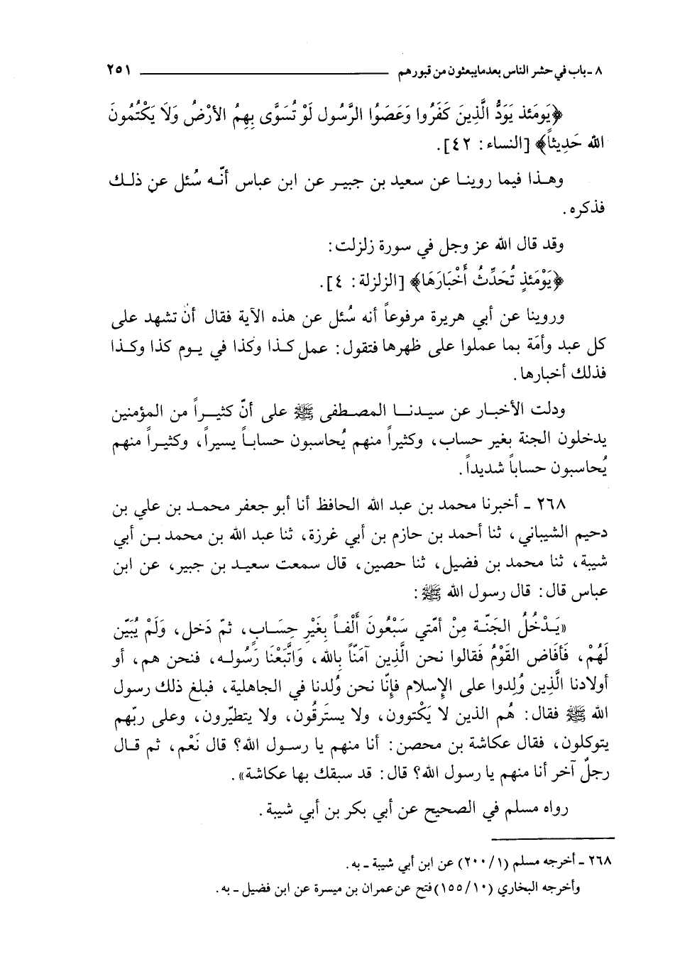 268 - أخبرنا محمد بن عبد الله الحافظ أنا أبو جعفر محمد بن علي بن دحيم الشيباني ثنا أحمد بن حازم بن أبي غرزة ثنا عبد الله بن محمد بن أبي شيبة ثنا محمد بن فضيل ثنا حصين قال سمعت سعيد بن جبير عن ابن عباس قال : قال رسول الله صلى الله عليه و سلم :