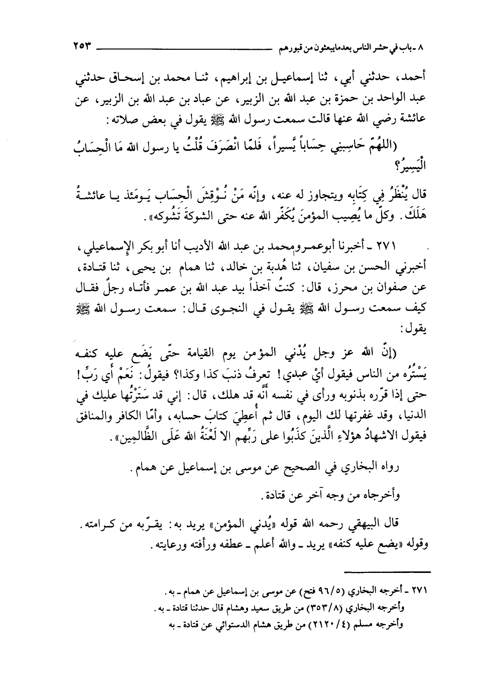 271 - أخبرنا أبو عمرو محمد بن عبد الله الأديب أنا أبو بكر الإسماعيل أخبرني الحسن بن سفيان ثنا هدبة بن خالد ثنا همام بن يحيى ثنا قتادة عن صفوان بن محرز قال : كنت آخذا بيد عبد الله بن عمر فأتاه رجل فقال كيف سمعت رسول الله صلى الله عليه و سلم يقول في النجوى قال : سمعت رسول الله صلى الله عليه و سلم يقول :