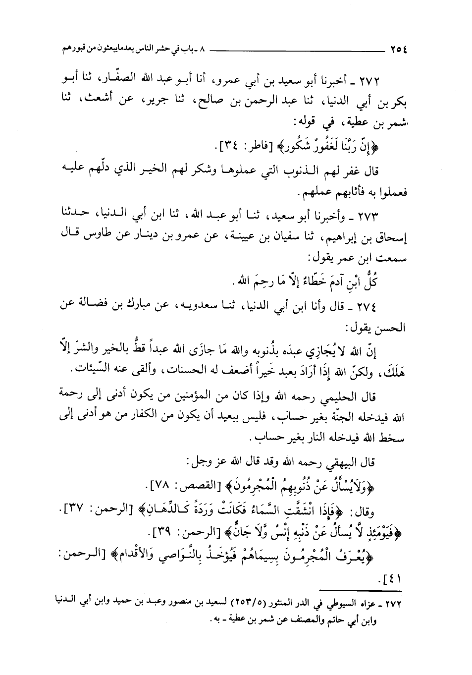274 - قال و أنا ابن أبي الدنيا ثنا سعدويه عن مبارك بن فضالة عن الحسن يقول : إن الله لا يجازي عبده بذنوبه و الله ما جازى الله عبدا قط بالخير و الشر إلا هلك و لكن الله إذا أراد بعبد خيرا أضعف له الحسنات و ألقى عنه السيئات