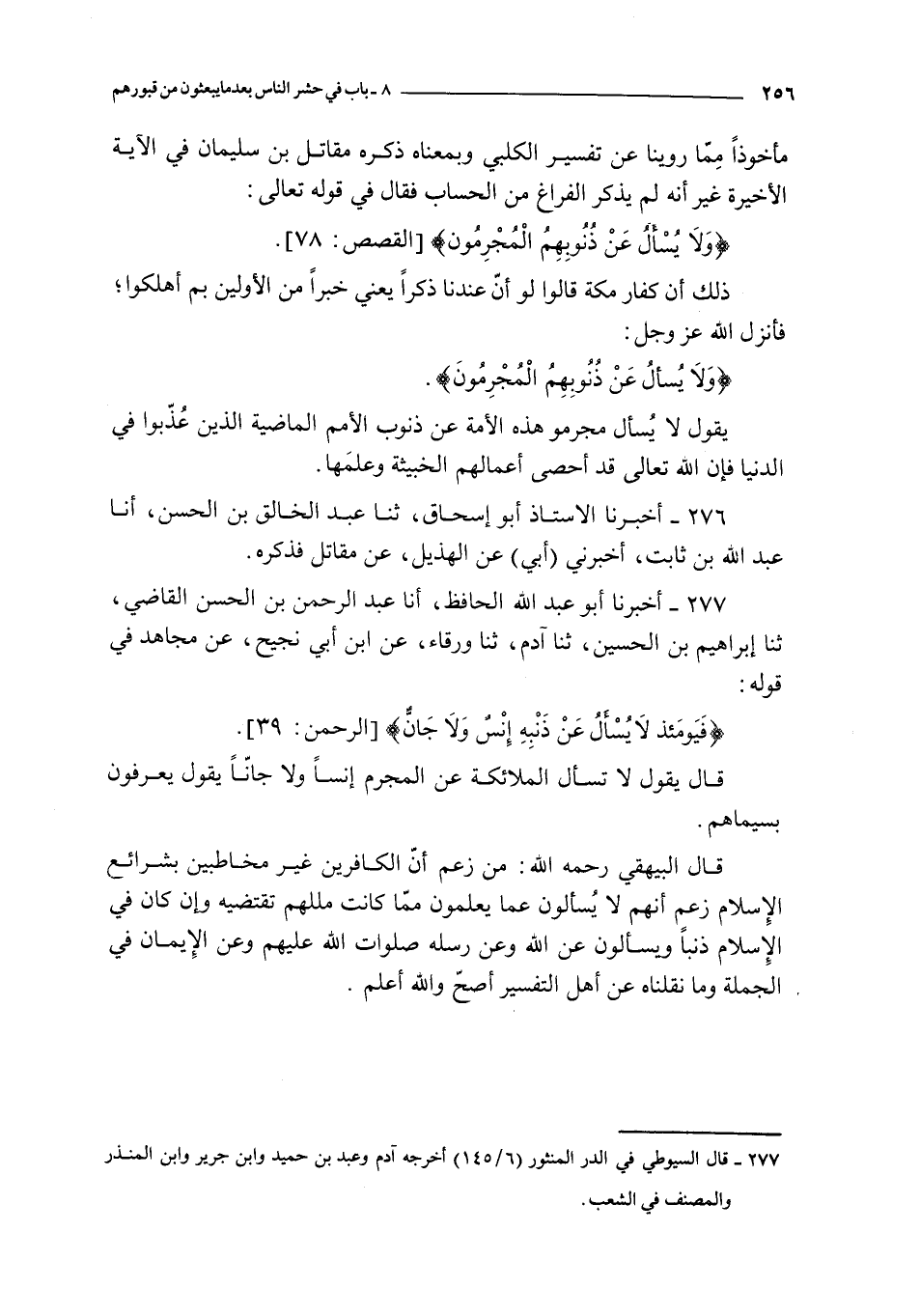 قال البيهقي رحمه الله : من زعم أن الكافرين غير مخاطبين بشرائع الإسلام زعم أنهم لا يسألون عما يعلمون مما كانت مللهم تقتضيه و إن كان في الإسلام ذنبا و يسألون عن الله و عن رسله صلوات الله عليهم و عن الإيمان في الجملة و ما نقلناه عن أهل التفسير أصح و الله أعلم