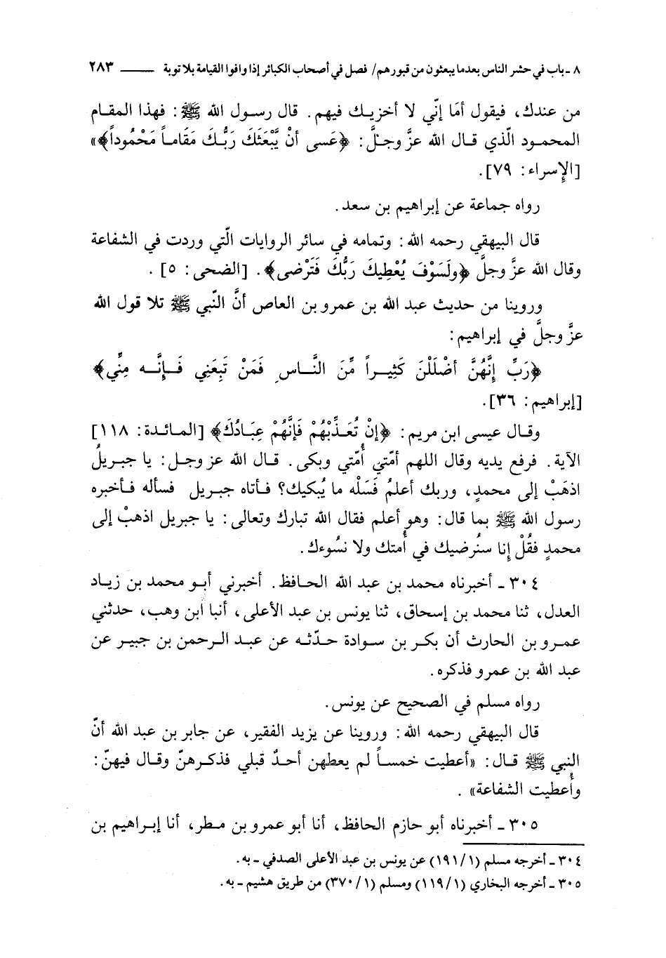 قال البيهقي رحمه الله : و روينا عن يزيد الفقير عن جابر بن عبد الله أن النبي صلى الله عليه و سلم قال : أعطيت خمسا لم يعطهن أحد قبلي فذكرهن و قال فيهن : و أعطيت الشفاعة