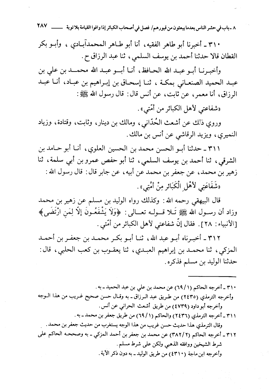 قال البيهقي رحمه الله : و كذلك رواه الوليد بن مسلم عن زهير بن محمد و زاد أن رسول الله صلى الله عليه و سلم تلا قوله تعالى : { و لا يشفعون إلا لمن ارتضى } فقال إن شفاعتي لأهل الكبائر من أمتي