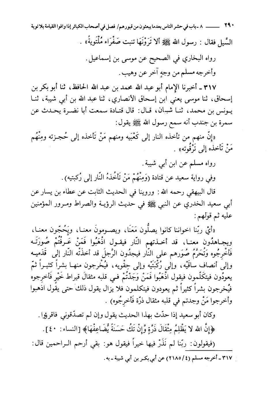 قال البيهقي رحمه الله : و روينا في الحديث الثابت عن عطاء بن يسار عن أبي سعيد الخدري عن النبي صلى الله عليه و سلم في حديث الرؤية و الصراط و مرور المؤمنين عليه ثم قولهم :