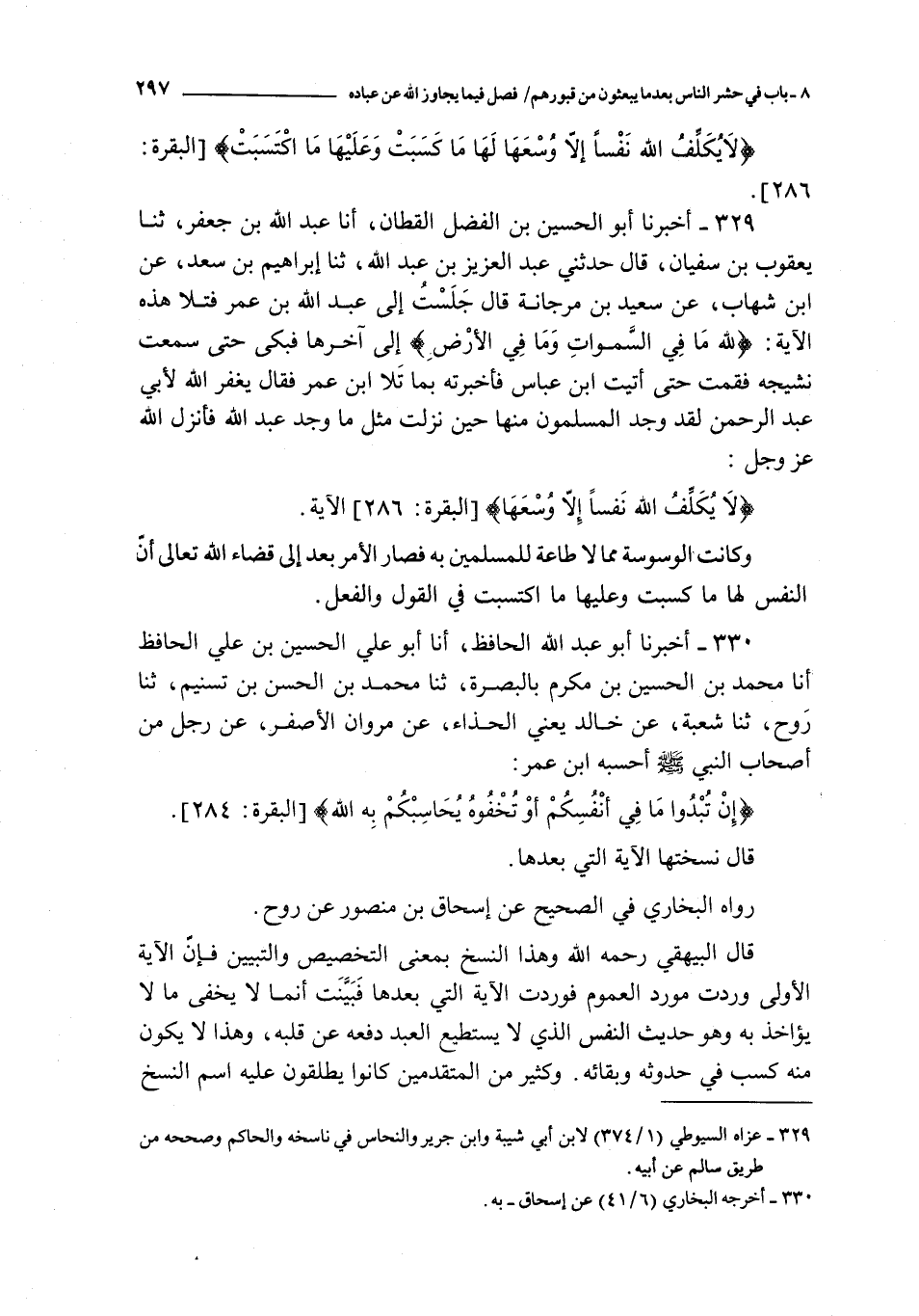 329 - أخبرنا أبو الحسين بن الفضل القطان أنا عبد الله بن جعفر ثنا يعقوب بن سفيان قال حدثني عبد العزيز بن عبد الله ثنا إبراهيم بن سعد عن ابن شهاب عن سعيد بن مرجانة قال : جلست إلى عبد الله بن عمر فتلا هذه الآية : { لله ما في السموات و ما في الأرض } إلى آخرها فبكى حتى سمع نشيجه فقمت حتى أتيت ابن عباس فأخبرته بما تلا ابن عمر فقال يغفر الله لأبي عبد الرحمن لقد وجد المسلمون منها حين نزلت مثل ما وجد ما وجد عبد الله فأنزل الله عز و جل :