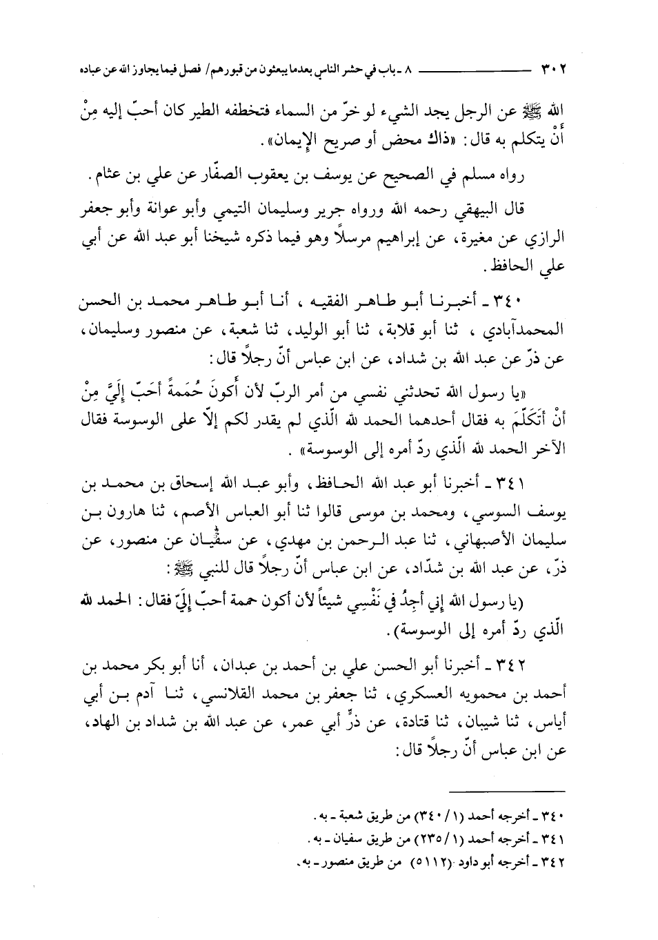 340 - أخبرنا أبو طاهر الفقيه أنا أبو طاهر محمد بن الحسن المحمدآبادي ثنا أبو قلابة ثنا أبو الوليد ثنا شعبة عن منصور و سليمان عن ذر عن عبد الله بن شداد عن ابن عباس أن رجلا قال : يا رسول الله تحدثني نفسي من أمر الرب لأن أكون حممة أحب إلي من أن أتكلم به فقال أحدهما الحمد لله الذي لم يقدر لكم إلا على الوسوسة فقال الآخر الحمد لله الذي رد أمره إلى الوسوسة