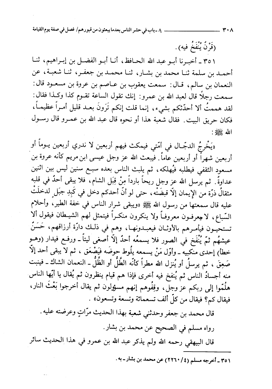 يخرج الدجال في أمتي فيمكث فيهم أربعين لا ندري أربعين يوما أو أربعين شهرا أو أربعين عاما فيبعث الله عز و جل عيسى ابن مريم كأنه عروة بن مسعود الثقفي فيطلبه فيهلكه ثم يلبث الناس بعده سبع سنين ليس بين اثنين عداوة ثم يرسل الله عز و جل ريحا باردا من قبل الشام فلا يبقى أحد في قلبه مثقال ذرة من الإيمان إلا قبضته حتى لو أن أحدكم دخل في كبد جبل لدخلت عليه قال سمعتها من رسول الله صلى الله عليه و سلم و يبقى شرار الناس في خفة الطير و أحلام السباع لا يعرفون معروفا و لا ينكرون منكرا فيتمثل لهم الشيطان فيقول ألا تستحيون فيأمرهم بالأوثان فيعبدونها و هم في ذلك دارة أرزاقهم حسن عيشهم ثم ينفخ في الصور فلا يسمعه أحد إلا أصغى ليتا ـ و رفع فيدار ( و هو خطأ ) إحدى منكبيه ـ و أول من يسمعه يلوط حوضه فيصعق ثم لا يبقى أحد إلا صعق ثم يرسل أو ينزل الله مطرا كأنه الطل أو الظل ـ النعمان الشاك ـ فينبت منه أجساد الناس ثم ينفخ فيه أخرى فإذا هم قيام ينظرون ثم يقال يا أيها الناس هلموا إلى ربكم عز و جل وقفوهم إنهم مسؤولون ثم يقال أخرجوا بعث النار فيقال كم ؟ فيقال من كل ألف تسعمائة و تسعة و تسعون
