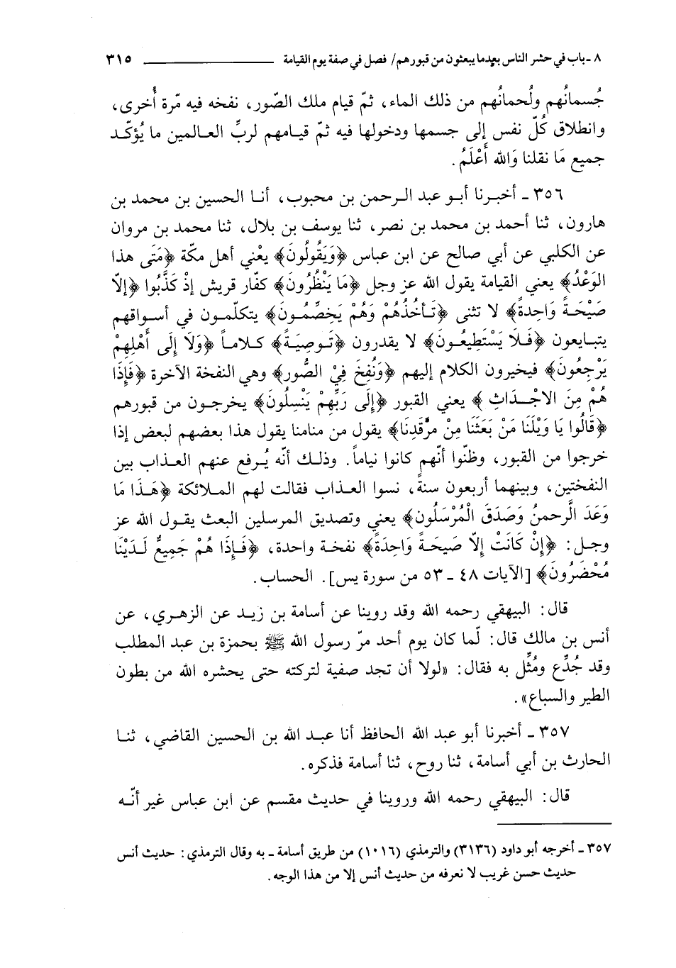 356 - أخبرنا أبو عبد الرحمن بن محبوب أنا الحسين بن محمد بن هارون ثنا أحمد بن محمد بن نصر ثنا يوسف بن بلال ثنا محمد بن مروان عن الكلبي عن أبي صالح عن ابن عباس : ـ { و يقولون } يعني أهل مكة { متى هذا الوعد } يعني القيامة يقول الله عز و جل { ما ينظرون } كفار قريش إذ كذبوا { إلا صيحة واحدة } لا تثنى { تأخذهم و هم يخصمون } يتكلمون في أسواقهم يتبايعون { فلا يستطيعون } لا يقدرون { توصية } كلاما { و لا إلى أهلهم يرجعون } فيخيرون الكلام إليهم { و نفخ في الصور } و هي النفخة الآخرة { فإذا هم من الأجداث } يعني القبور { إلى ربهم ينسلون } يخرجون من قبورهم { قالوا يا ويلنا من بعثنا من مرقدنا } يقول من منامنا يقول هذا بعضهم لبعض إذا خرجوا من القبور و ظنوا أنهم كانوا نياما و ذلك أنه يرفع عنهم العذاب بين النفختين و بينهما أربعون سنة نسوا العذاب فقالت لهم الملائكة { هذا ما وعد الرحمن و صدق المرسلون } يعني وتصديق المرسلين البعث يقول الله عز و جل : { إن كانت إلا صيحة واحدة } نفخة واحدة { فإذا هم جميع لدينا محضرون } الحساب