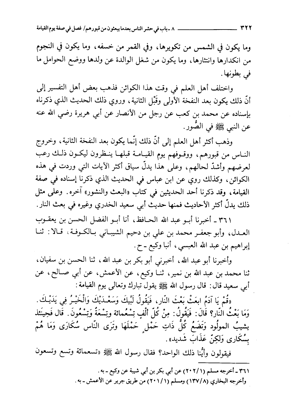 قم يا آدم ابعث بعث النار فيقول لبيك و سعديك و الخير في يديك و ما بعث النار ؟ قال : فيقول : من كل ألف تسعمائة و تسعة و تسعون قال فحينئذ يشيب المولود و تضع كل ذات حمل حملها و ترى الناس سكارى و ما هم بسكارى و لكن عذاب الله شديد