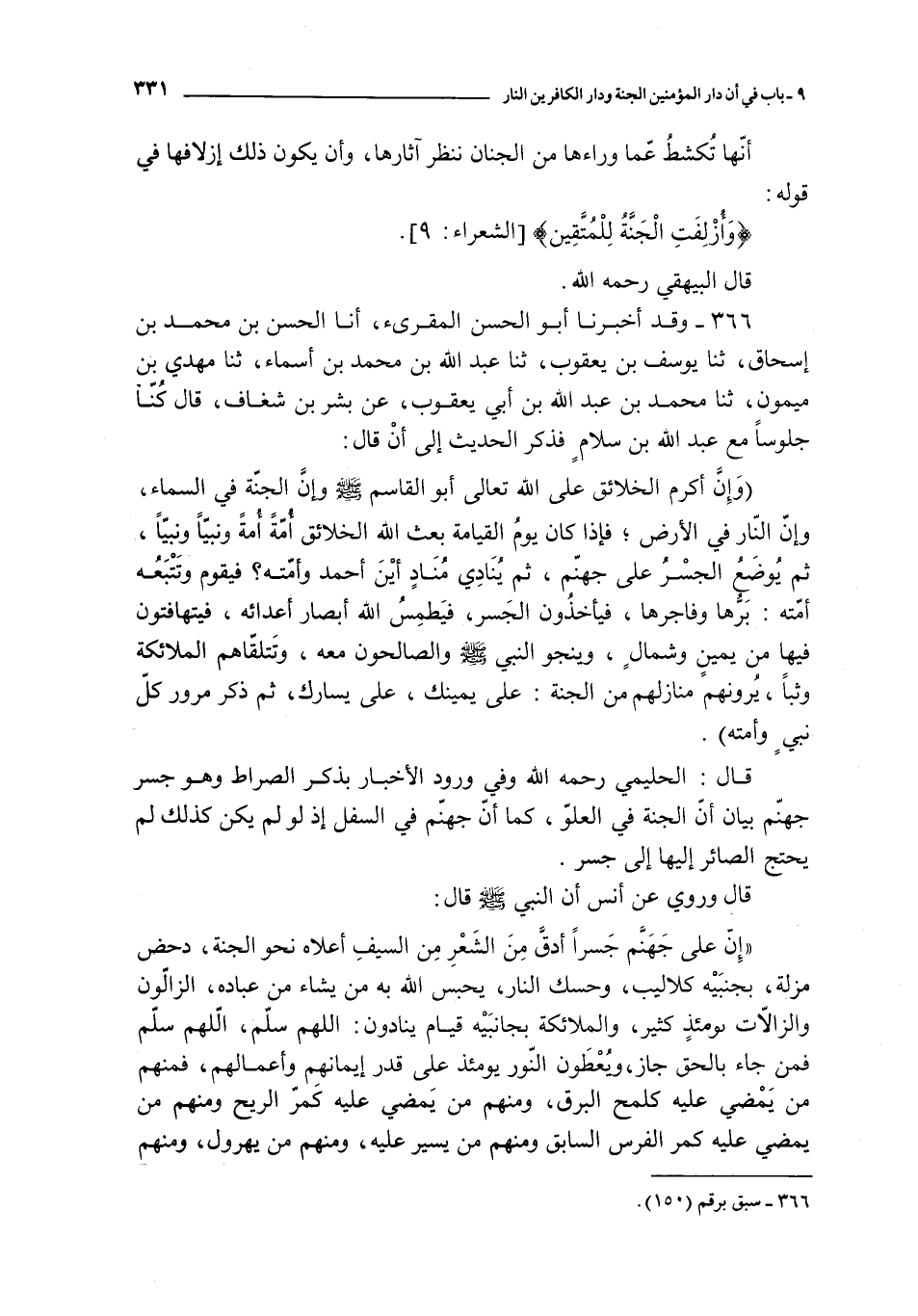 قال : الحليمي رحمه الله و في ورود الأخبار بذكر الصراط و هو جسر جهنم بيان أن الجنة في العلو كما أن جهنم في السفل إذ لو لم يكن كذلك لم يحتج الصائر إليها إلى جسر