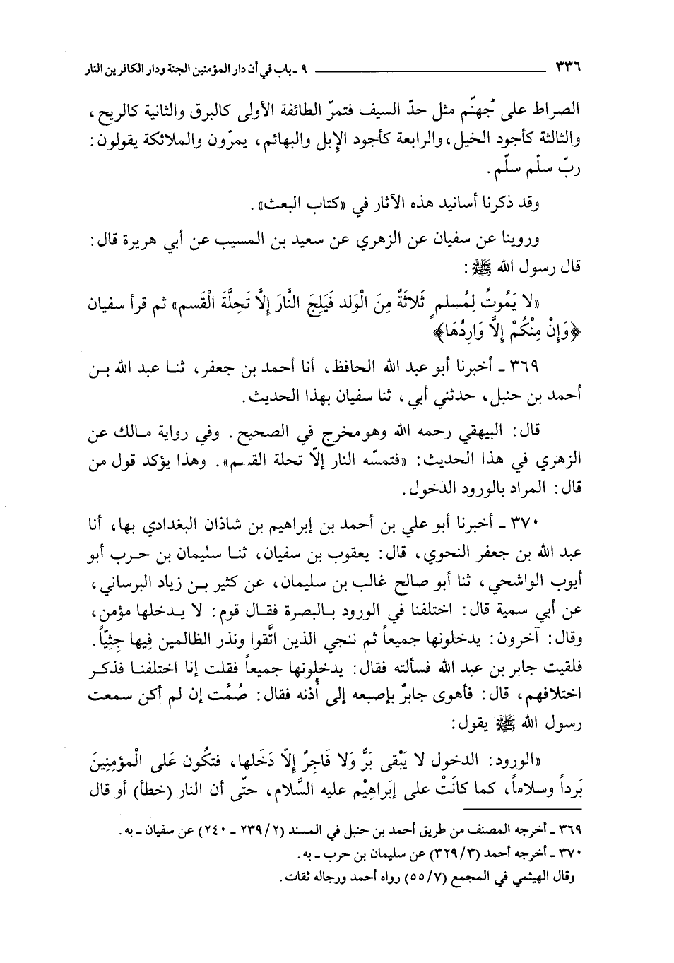 قال : البيهقي رحمه الله و هو مخرج في الصحيح و في رواية مالك عن الزهري في هذا الحديث : فتمسه النار إلا تحلة القسم و هذا يؤكد قول من قال : المراد بالورود الدخول