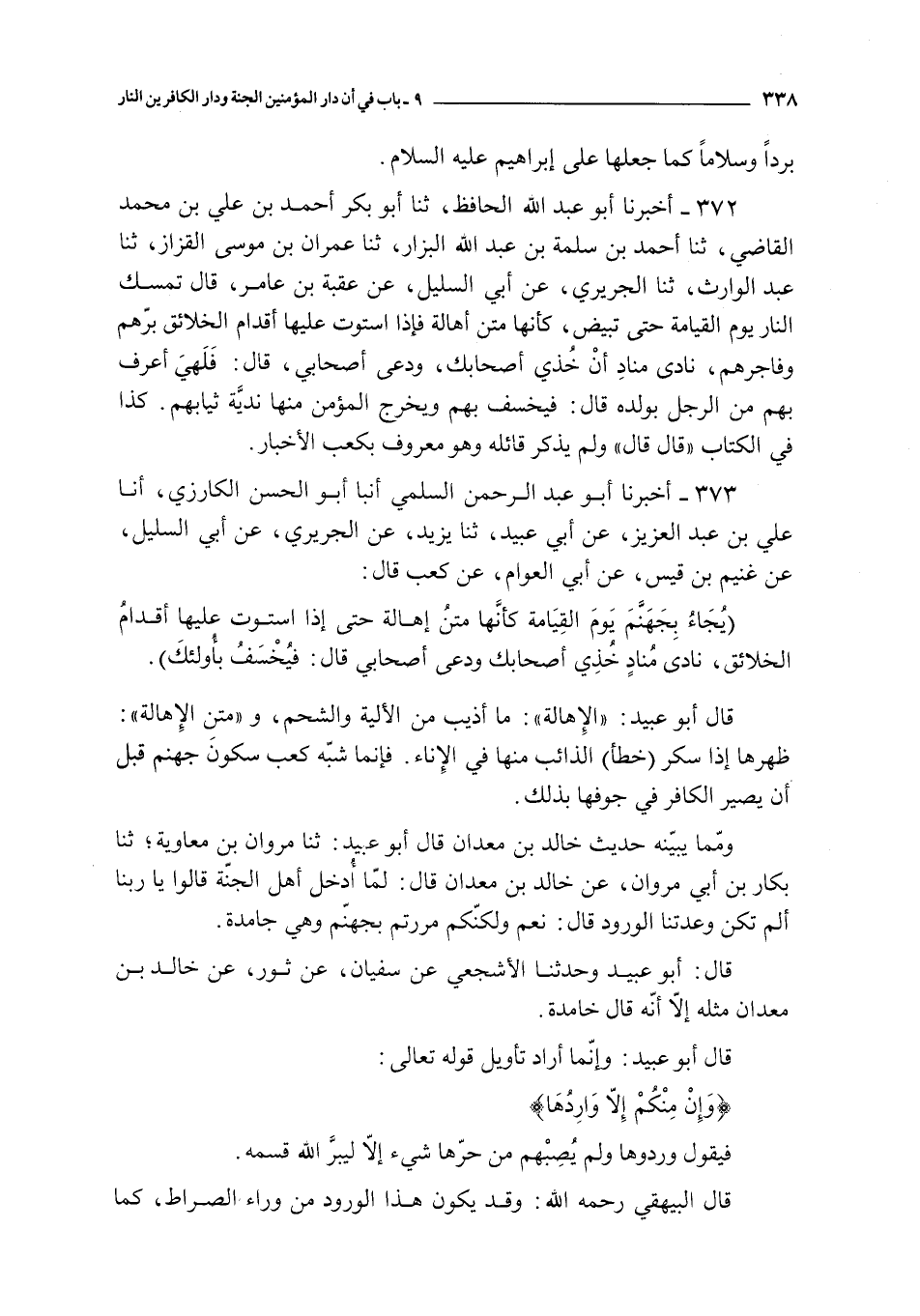 373 - أخبرنا أبو عبد الرحمن السلمي أنبا أبو الحسن الكارزي أنا علي بن عبد العزيز عن أبي عبيد ثنا يزيد عن الجريري عن أبي السليل عن غينم بن قيس عن أبي العوام عن كعب قال : يجاء بجهنم يوم القيامة كأنها متن إهالة حتى إذا استوت عليك أقدام الخلائق نادى مناد خذي أصحابك و دعي أصحابي قال : فيخسف بأولئك ؟