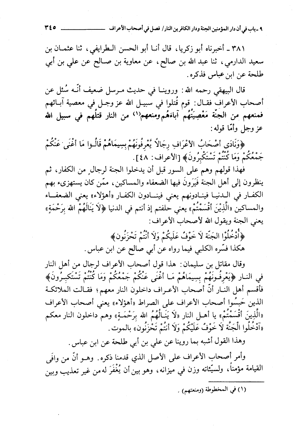 قال البيهقي رحمه الله : و روينا في حديث مرسل ضعيف أنه سئل عن أصحاب الأعراف فقال : قوم قتلوا في سبيل الله عز و جل في معصية آبائهم فمنعهم من الجنة معصيتهم آباءهم و منعهم من النار قتلهم في سبيل الله عز و جل و أما قوله :