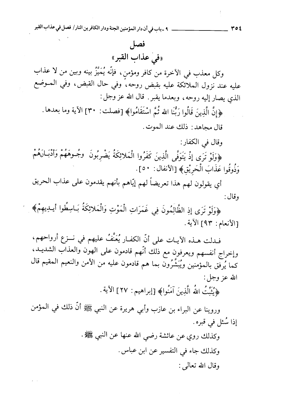 فصل في عذاب القبر ـ و كل معذب في الآخرة من كافر و مؤمن فإنه يميز بينه و بين من لا عذاب عليه عند نزول الملائكة عليه بقبض روحه و في حال القبض و في الموضع الذي يصار إليه روحه و بعدما يقبر قال الله عز و جل : { إن الذين قالوا ربنا الله ثم استقاموا } الآية و ما بعدها قال مجاهد : ذلك عند الموت و قال في الكفار : { ولو ترى إذ يتوفى الذين كفروا الملائكة يضربون وجوههم وأدبارهم وذوقوا عذاب الحريق } أي يقولون لهم هذا تعريضا لهم إياهم بأنهم يقدمون على عذاب الحريق و قال : { ولو ترى إذ الظالمون في غمرات الموت والملائكة باسطوا أيديهم } الآية فدلت هذه الآيات على أن الكفار يعنف عليهم في نزع أرواحهم و إخراج أنفسهم و يعرفون مع ذلك أنهم قادمون على الهون و العذاب الشديد كما يرفق بالمؤمنين و يبشرون بما هم قادمون عليه من الأمن و النعيم المقيم قال الله عز و جل : { يثبت الله الذين آمنوا } الآية و روينا عن البراء بن عازب و أبي هريرة عن النبي صلى الله عليه و سلم أن ذلك في المؤمن إذا سئل في قبره و كذلك روي عن عائشة رضي الله عنها عن النبي صلى الله عليه و سلم و كذلك جاء في التفسير عن ابن عباس و قال الله تعالى : { وحاق بآل فرعون سوء العذاب * النار يعرضون عليها غدوا وعشيا ويوم تقوم الساعة } و قال مجاهد : يعني بقوله : { يعرضون عليها غدوا و عشيا } ما كانت الدنيا و قال قتادة : يقال لهم : يا آل فرعون هذه منازلكم توبيخا و صغارا و نقمة و قال في المنافقين : { سنعذبهم مرتين ثم يردون إلى عذاب عظيم } و قال قتادة : عذاب في القبر و عذاب في النار و قال فيمن أعرض عن ذكر الله : { ومن أعرض عن ذكري فإن له معيشة ضنكا ونحشره يوم القيامة أعمى } و روينا عن أبي سعيد الخدري و أبي هريرة مرفوعا إلى النبي صلى الله عليه و سلم و موقوفا عليهما ثم عن ابن مسعود و ابن عباس من قولهما أن ذلك في عذاب القبر و روينا عن عطاء في قوله : { إذا لأذقناك ضعف الحياة و ضعف الممات } قال : ضعف الممات : عذاب القبر و روينا عن ابن عباس في قوله : { و إن للذين ظلموا عذابا دون ذلك } قال : عذاب يوم القيامة و قد ذكرنا الأحاديث التي وردت في هذا الباب في كتاب عذاب القبر فأغنى ذلك عن سياقها ها هنا لكنا نذكر مقدار ما يتبين به المقصود بالباب و بالله التوفيق
