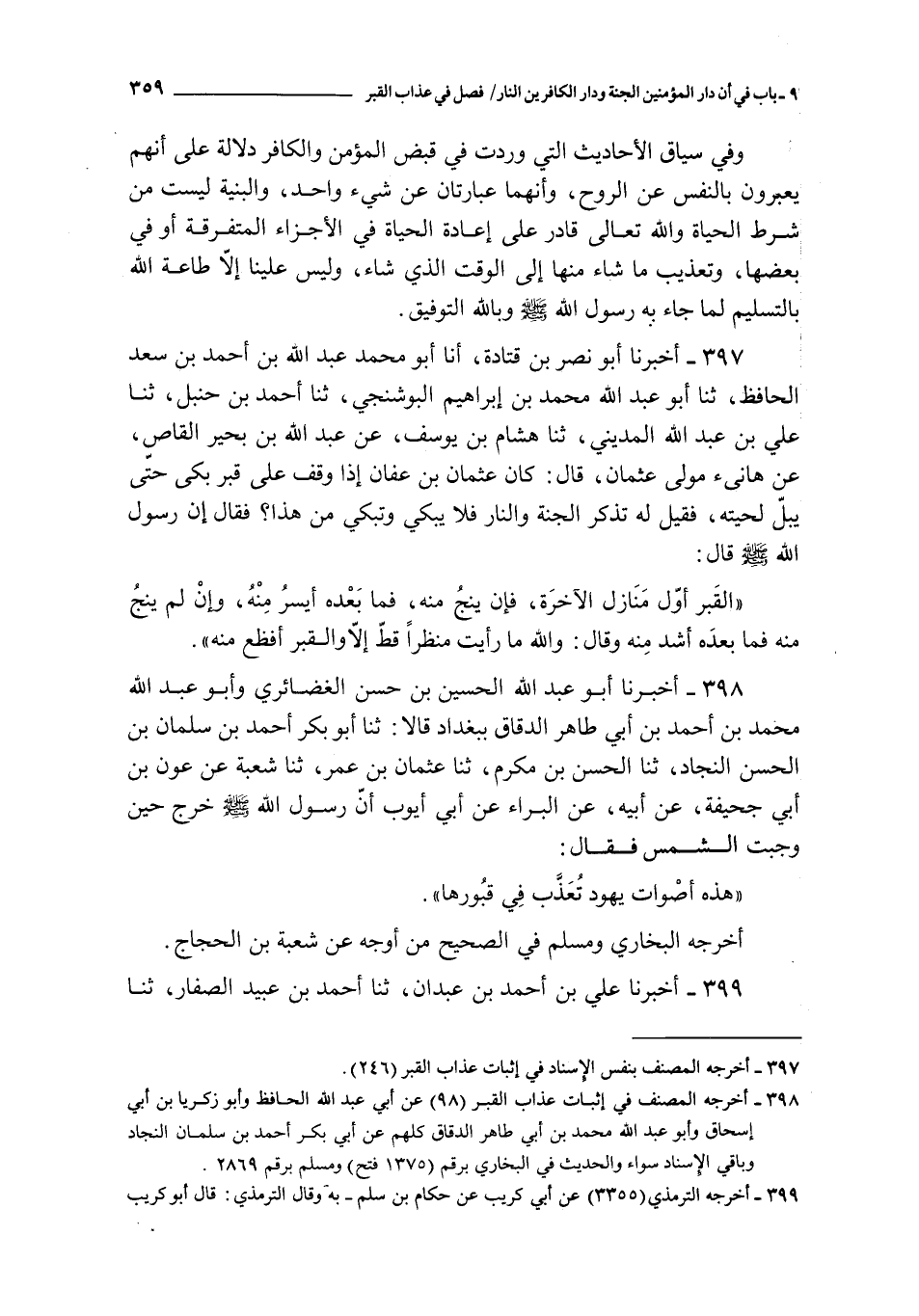 397 - أخبرنا أبو نصر بن قتادة أنا أبو محمد عبد الله بن أحمد بن سعد الحافظ ثنا أبو عبد الله محمد بن إبراهيم البوشنجي ثنا أحمد بن حنبل ثنا علي بن عبد الله المديني ثنا هشام بن يوسف عن عبد الله بن بحير القاص عن هانئ مولى عثمان قال : كان عثمان بن عفان إذا وقف على قبر بكى حتى يبل لحيته فقيل له تذكر الجنة و النار فلا تبكي و تبكي من هذا ؟ فقال إن رسول الله صلى الله عليه و سلم قال :