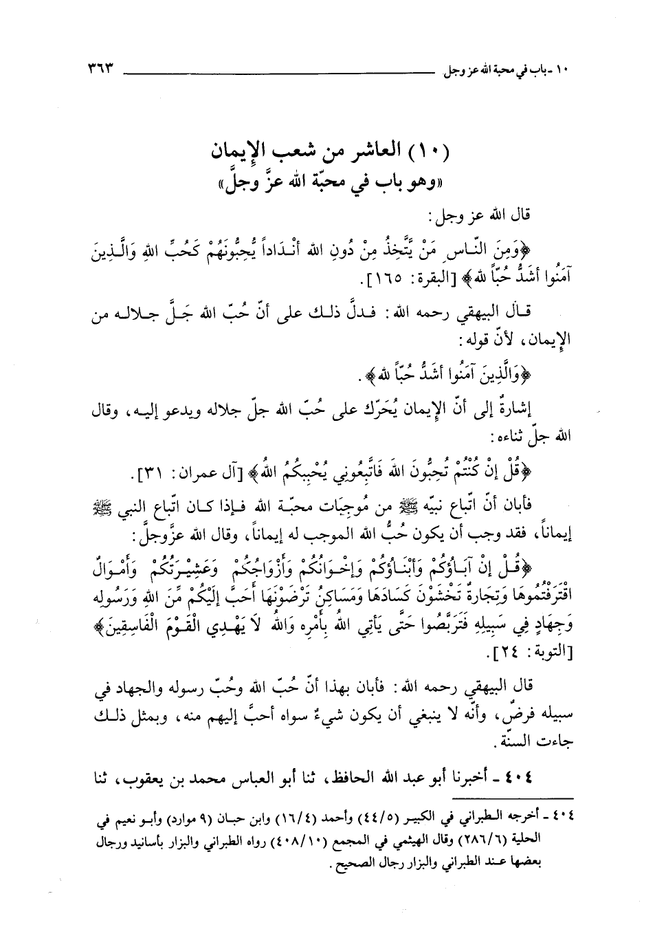 العاشر من شعب الإيمان و هو باب في محبة الله عز و جل ـ قال الله عز و جل : { ومن الناس من يتخذ من دون الله أندادا يحبونهم كحب الله والذين آمنوا أشد حبا لله } قال البيهقي رحمه الله : فدل ذلك على أن حب الله جل جلاله من الإيمان لأن قوله : { و الذين آمنوا أشد حبا لله } إشارة إلى أن الإيمان يحرك على حب الله جل جلاله و يدعو إليه و قال الله جل ثناءه : { قل إن كنتم تحبون الله فاتبعوني يحببكم الله } فأبان أن اتباع نبيه صلى الله عليه و سلم من موجبات محبة الله فإذا كان اتباع النبي صلى الله عليه و سلم إيمانا فقد وجب أن يكون حب الله الموجب له إيمانا و قال الله عز و جل : { قل إن كان آباؤكم وأبناؤكم وإخوانكم وأزواجكم وعشيرتكم وأموال اقترفتموها وتجارة تخشون كسادها ومساكن ترضونها أحب إليكم من الله ورسوله وجهاد في سبيله فتربصوا حتى يأتي الله بأمره والله لا يهدي القوم الفاسقين } قال البيهقي رحمه الله : فأبان بهذا أن حب الله و حب رسوله و الجهاد في سبيله فرض و أنه لا ينبغي أن يكون شيء سواه أحب إليهم منه و بمثل ذلك جاءت السنة