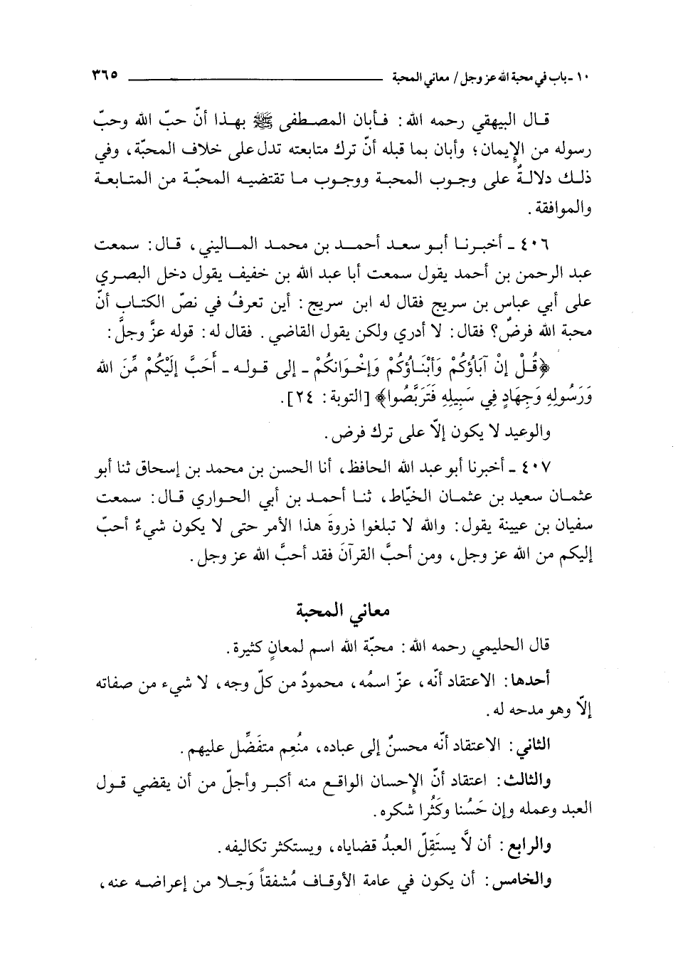 406 - أخبرنا أبو سعد أحمد بن محمد الماليني قال : سمعت عبد الرحمن بن أحمد يقول سمعت أبا عبد الله بن خفيف يقول : دخل البصري على أبي عباس بن سريج فقال له ابن سريج : أين تعرف في نص الكتاب أن محبة الله فرض ؟ فقال : لا أدري و لكن يقول القاضي فقال له : قوله عز و جل :