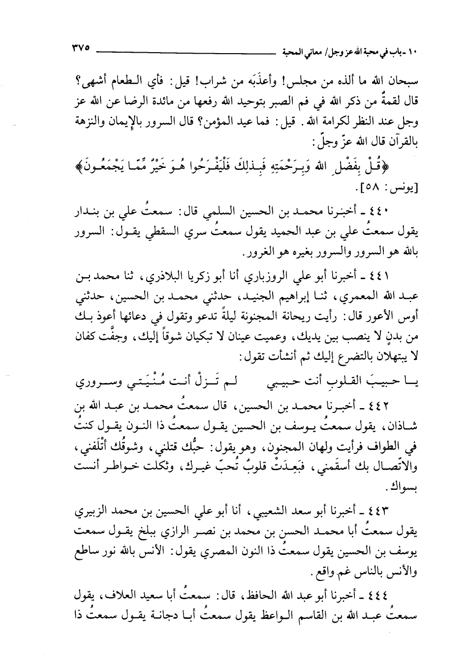 442 - أخبرنا محمد بن الحسين قال سمعت محمد بن عبد الله بن شاذان يقول سمعت يوسف بن الحسين يقول سمعت ذا النون يقول : كنت في الطواف فرأيت ولهان المجنون و هو يقول : حبك قتلني و شوقك أتلفني و الاتصال بك أسقمني فبعدت قلوب تحب غيرك و ثكلت خواطر أنست بسواك