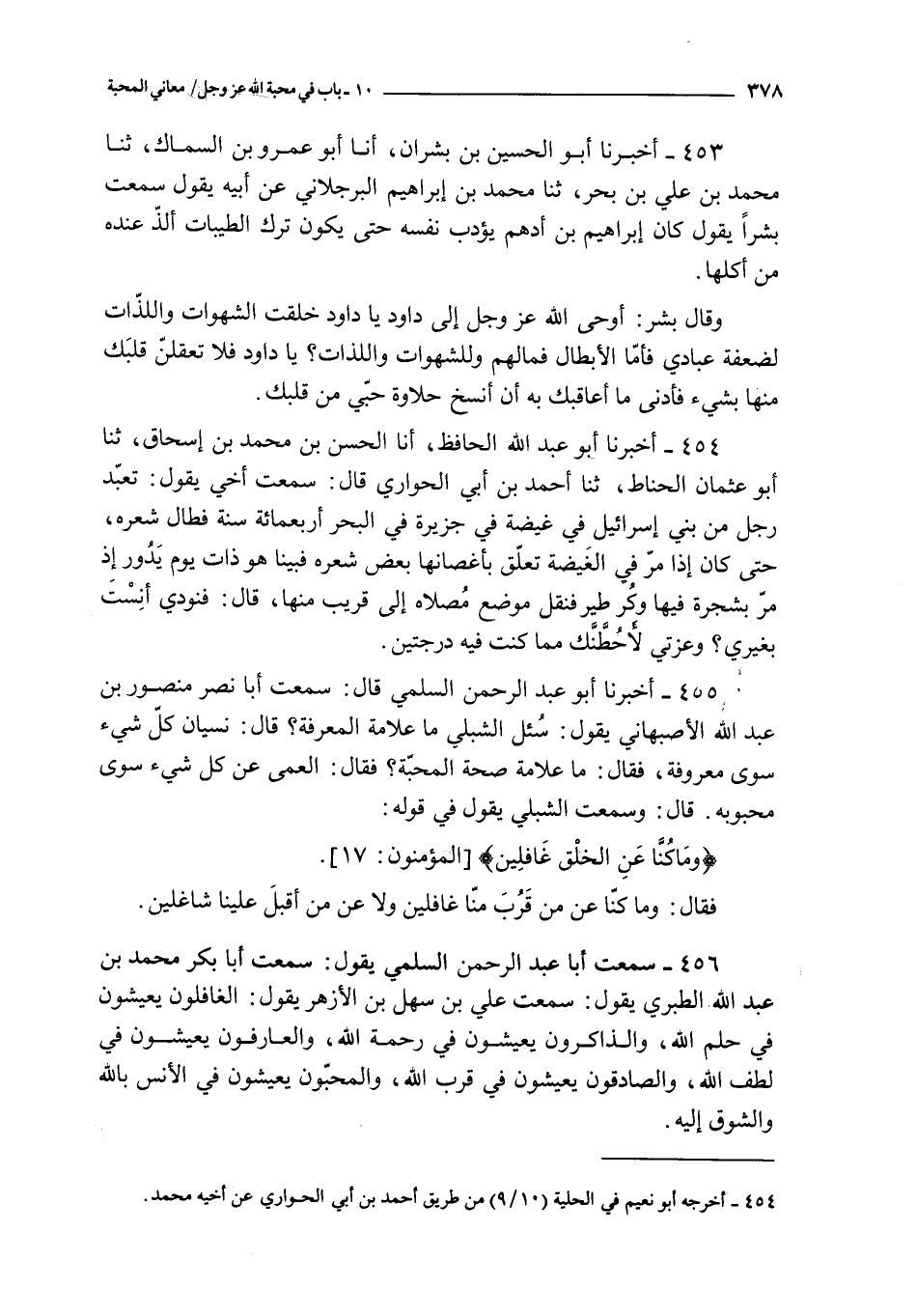 455 - أخبرنا أبو عبد الرحمن السلمي قال : سمعت أبا منصور بن عبد الله الأصبهاني يقول : سئل الشبلي ما علامة المعرفة ؟ قال : نسيان كل شيء معروقة فقال : ما علامة صحة المحبة ؟ قال : العمى عن كل شيء سوى محبوبه قال : و سمعت الشبلي يقول في قوله :