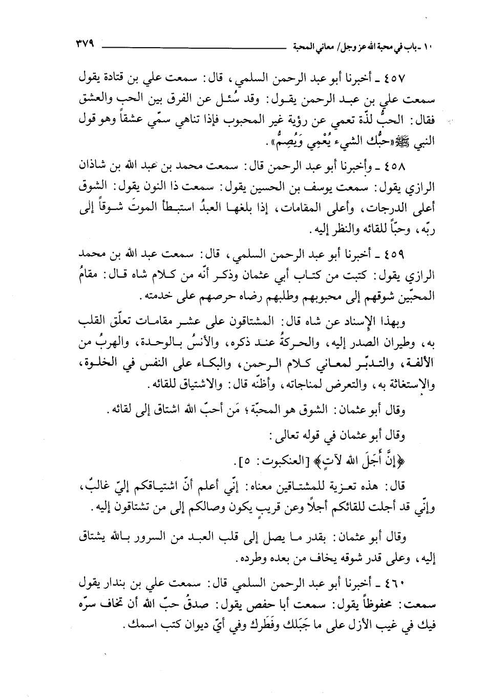 459 - أخبرنا أبو عبد الرحمن السلمي قال : سمعت عبد الله بن محمد الرازي يقول : كتبت من كتاب أبي عثمان و ذكر أنه من كلام شاه قال : مقام المحبين شوقهم إلى محبوبهم و طلبهم رضاه حرصهم على خدمته