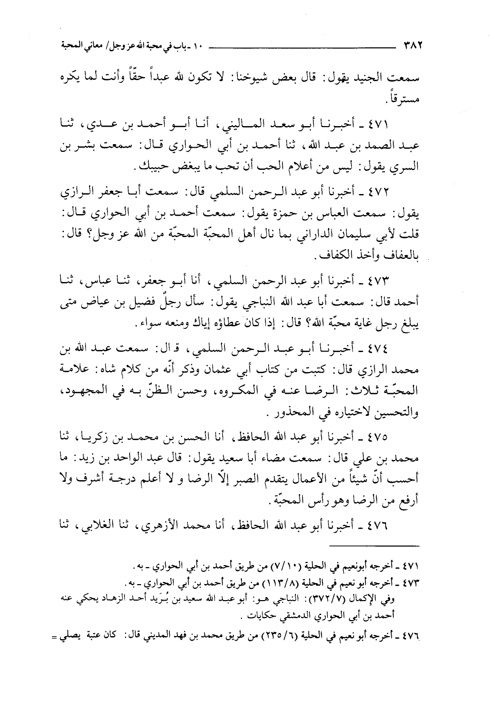 472 - أخبرنا أبو عبد الرحمن السلمي قال : سمعت أبا جعفر الرازي يقول : سمعت العباس بن حمزة يقول : سمعت أحمد بن أبي الحواري قال : قلت لأبي سليمان الداراني بما نال أهل المحبة المحبة من الله عز و جل ؟ قال بالعفاف و أخذ الكفاف