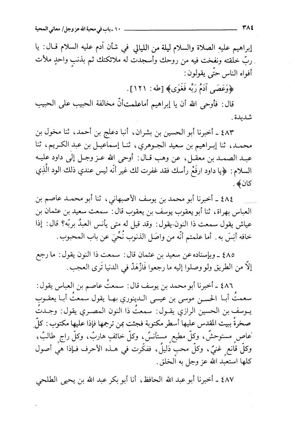 486 - أخبرنا أبو محمد بن يوسف قال : سمعت عاصم بن العباس يقول : سمعت أبا الحسن موسى بن عيسى الدينوري بها يقول سمعت أبا يعقوب يوسف بن الحسين الرازي يقول : سمعت ذا النون المصري يقول : وجدت صخرة ببيت المقدس عليها أسطر مكتوبة فجئت بمن ترجمها فإذا عليها مكتوب : كل عاص مستوحش و كل مطيع مستأنس و كل خائف هارب و كل راج طالب و كل قانع غني و كل محب ذليل ففكرت في هذه الأحرف فإذا هي أصول كلها استعبد الله عز و جل به الخلق