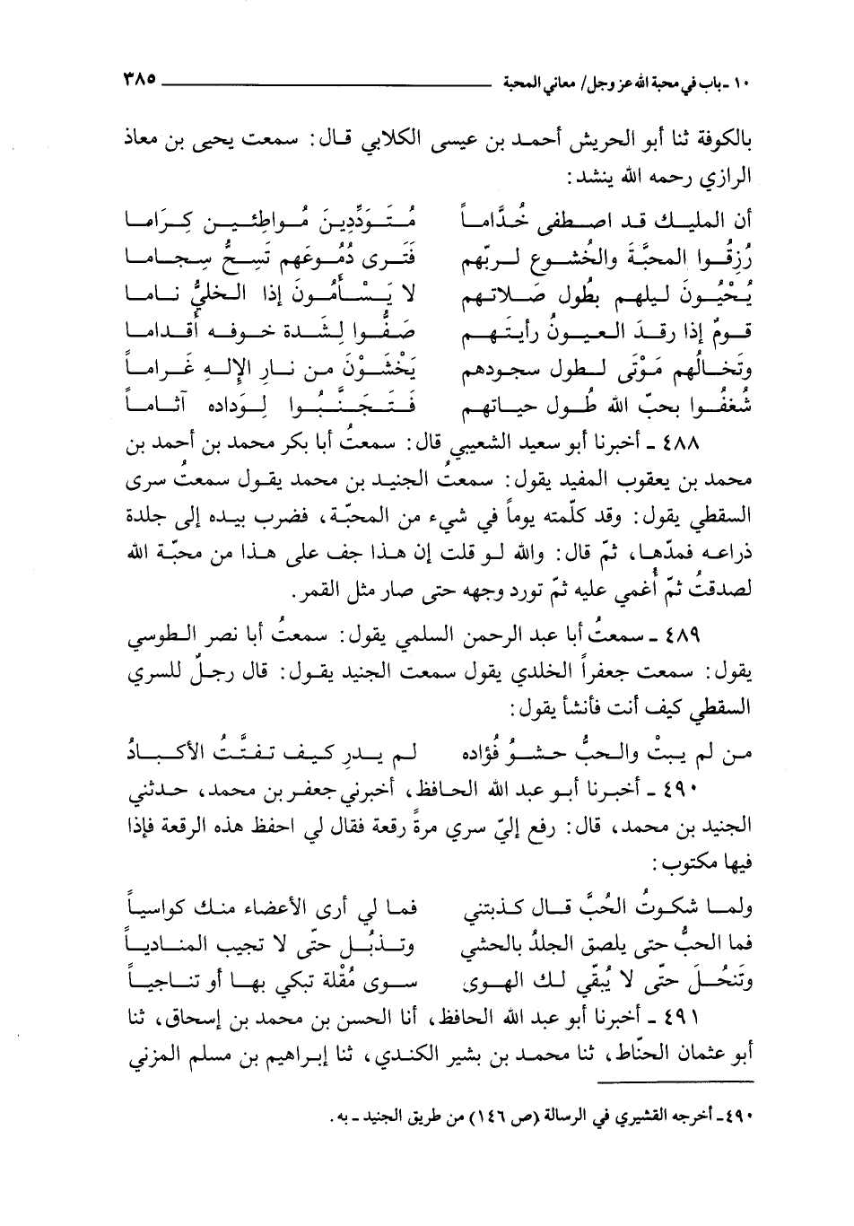 489 - سمعت أبا عبد الرحمن السلمي يقول : سمعت أبا نصر الطوسي يقول : سمعت جعفرا الخلدي يقول سمعت الجنيد يقول : قال رجل للسري السقطي كيف أنت فأنشأ يقول :