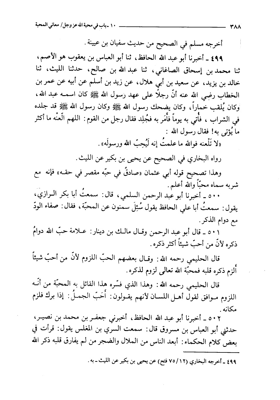 500 - أخبرنا أبو عبد الرحمن السلمي قال : سمعت أبا بكر الرازي يقول : سمعت أبا علي الحافظ يقول : سئل سمنون عن المحبة فقال : صفاء الود مع دوام الذكر