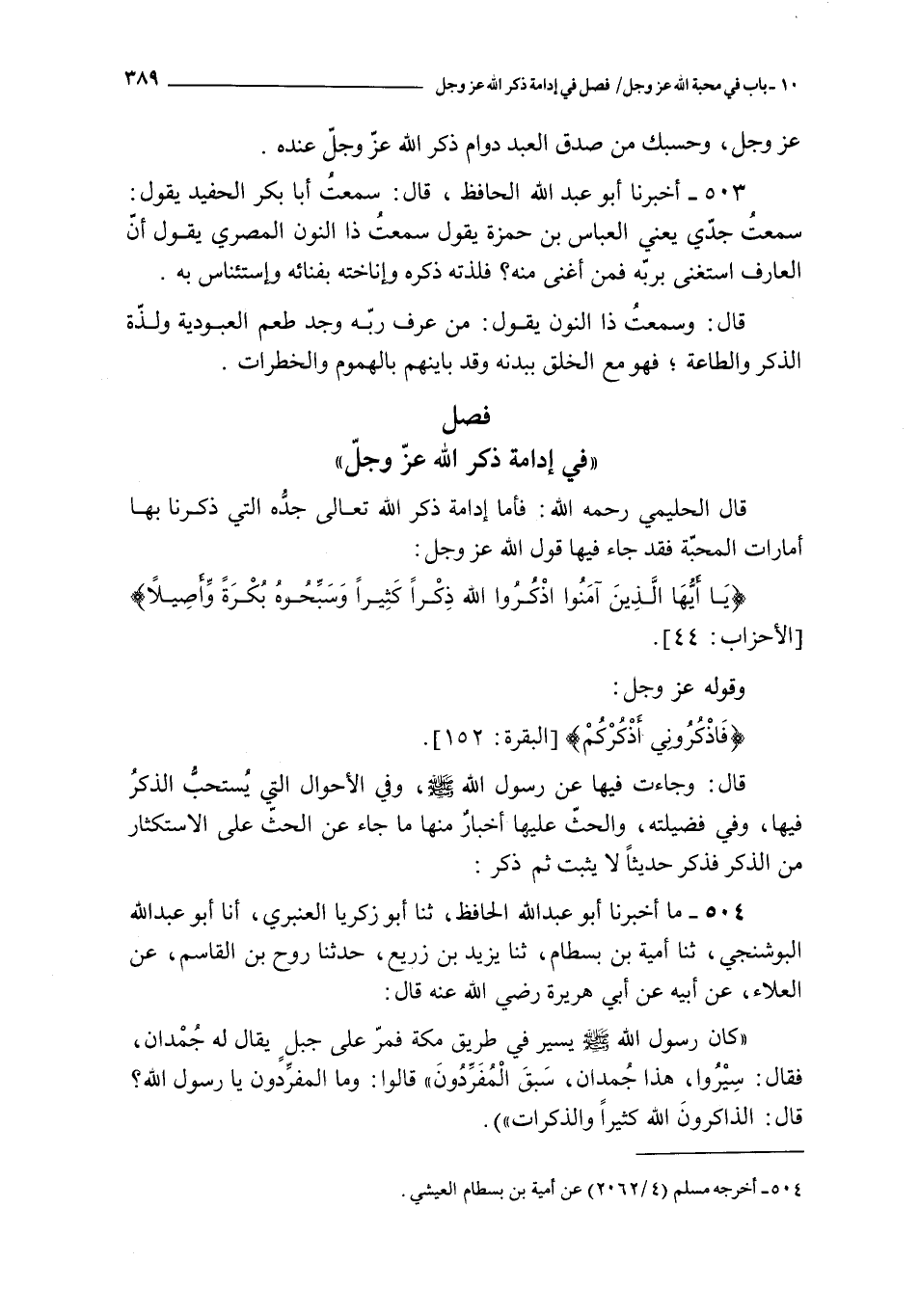 فصل في إدامة ذكر الله عز و جل ـ قال الحليمي رحمه الله : فأما إدامة ذكر الله تعالى جده التي ذكرنا بها أمارات المحبة فقد جاء فيها قول الله عز و جل { يا أيها الذين آمنوا اذكروا الله ذكرا كثيرا * وسبحوه بكرة وأصيلا } و قوله عز و جل : { فاذكروني أذكركم } قال : و جاءت فيها عن رسول الله صلى الله عليه و سلم و في الأحوال التي يستحب الذكر فيه و في فضيلته و الحث عليها أخبار منها ما جاء عن الحث على الاستكثار من الذكر فذكر حديثا لا يثبت ثم ذكر