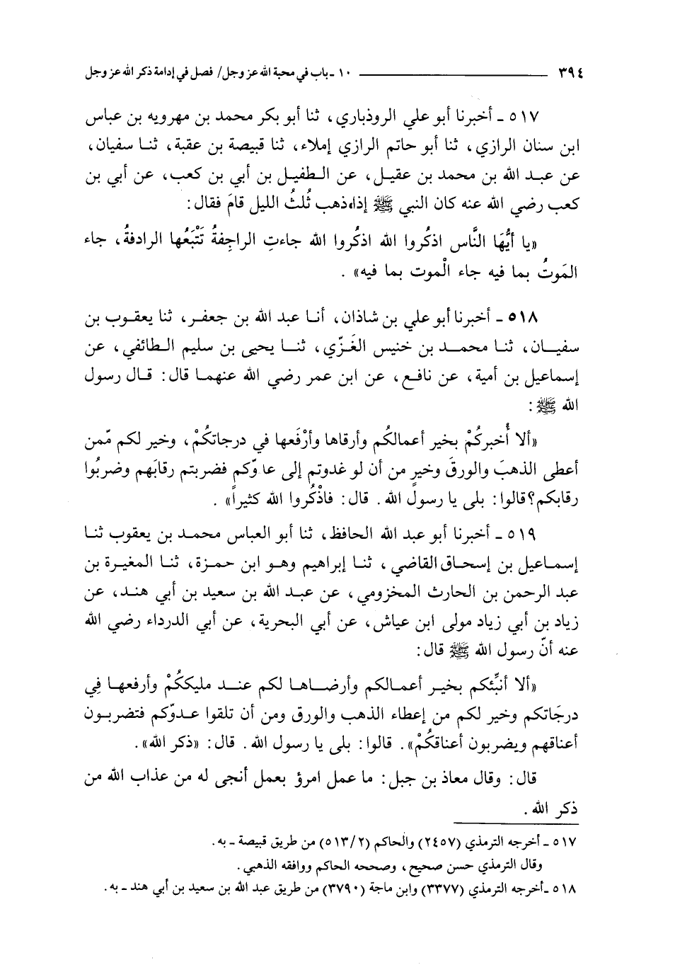 517 - أخبرنا أبو علي الروذباري ثنا أبو بكر محمد بن مهرويه بن عباس ابن سنان الرازي ثنا أبو حاتم الرازي إملاء ثنا قبيصة بن عقبة ثنا سفيان عن عبد الله بن محمد بن عقيل عن الطفيل بن أبي كعب عن أبي بن كعب رضي الله عنه : كان النبي صلى الله عليه و سلم إذا ذهب ثلث الليل قام فقال :