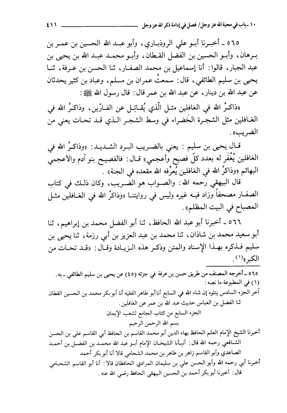 قال البيهقي رحمه الله : و الصواب هو الضريب و كان ذلك في كتاب الصفار مصحفا و زاد فيه غيره و ليس في روايتنا و ذاكر الله في الغافلين مثل المصباح في البيت المظلم