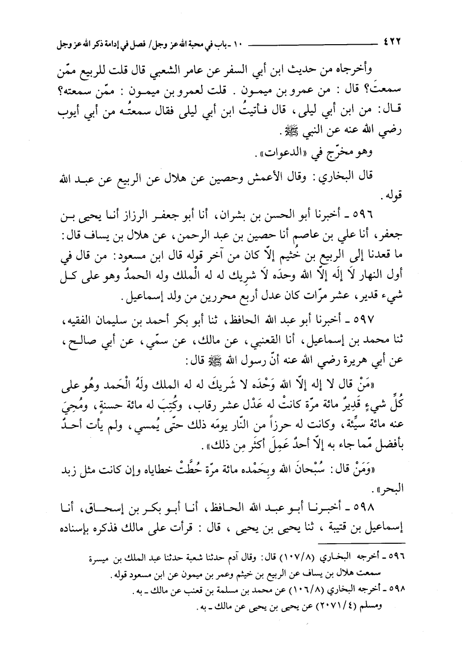 596 - أخبرنا أبو الحسن بن بشران أنا أبو جعفر الرزاز أنا يحيى بن جعفر أنا علي بن عاصم أنا حصين بن عبد الرحمن عن هلال بن يساف قال : ما قعدنا إلى الربيع بن خيثم إلا كان من آخر قوله قال ابن مسعود : من قال في أول النهار لا إله إلا الله وحده لا شريك له الملك و له الحمد و هو على كل شيء قدير عشر مرات كان عدل أربع محررين من ولد إسماعيل